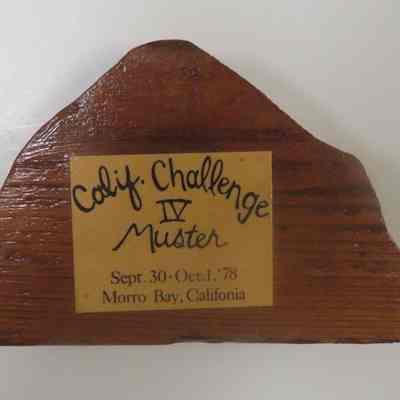 Wood plaque in unique somewhat triangular shape with a tan colored paper on the front. Inscription reads: Calif. Challenge IV Muster, Sept. 30 - Oct. 1, 1978. Morro Bay, California