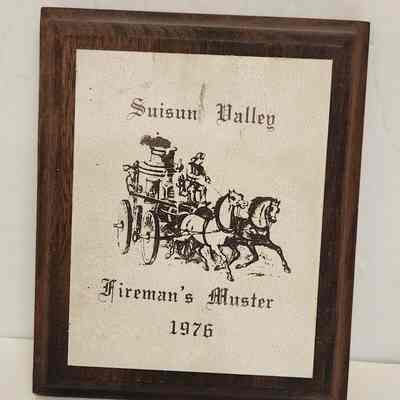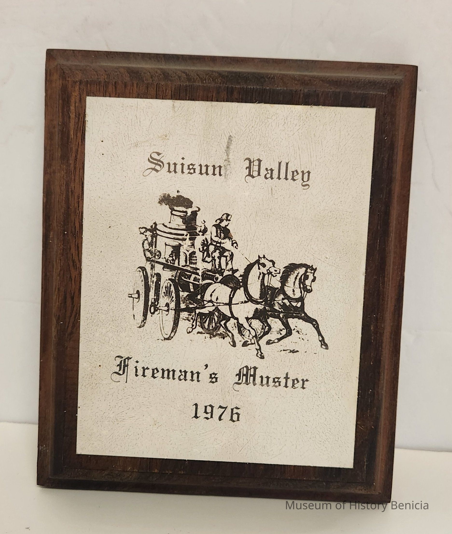 Wood plaque with painted metal plate; Ecru paint on metal plate with brown ink; Suisun Valley / [pumper pulled by horses logo] / Fireman's Muster / 1976
