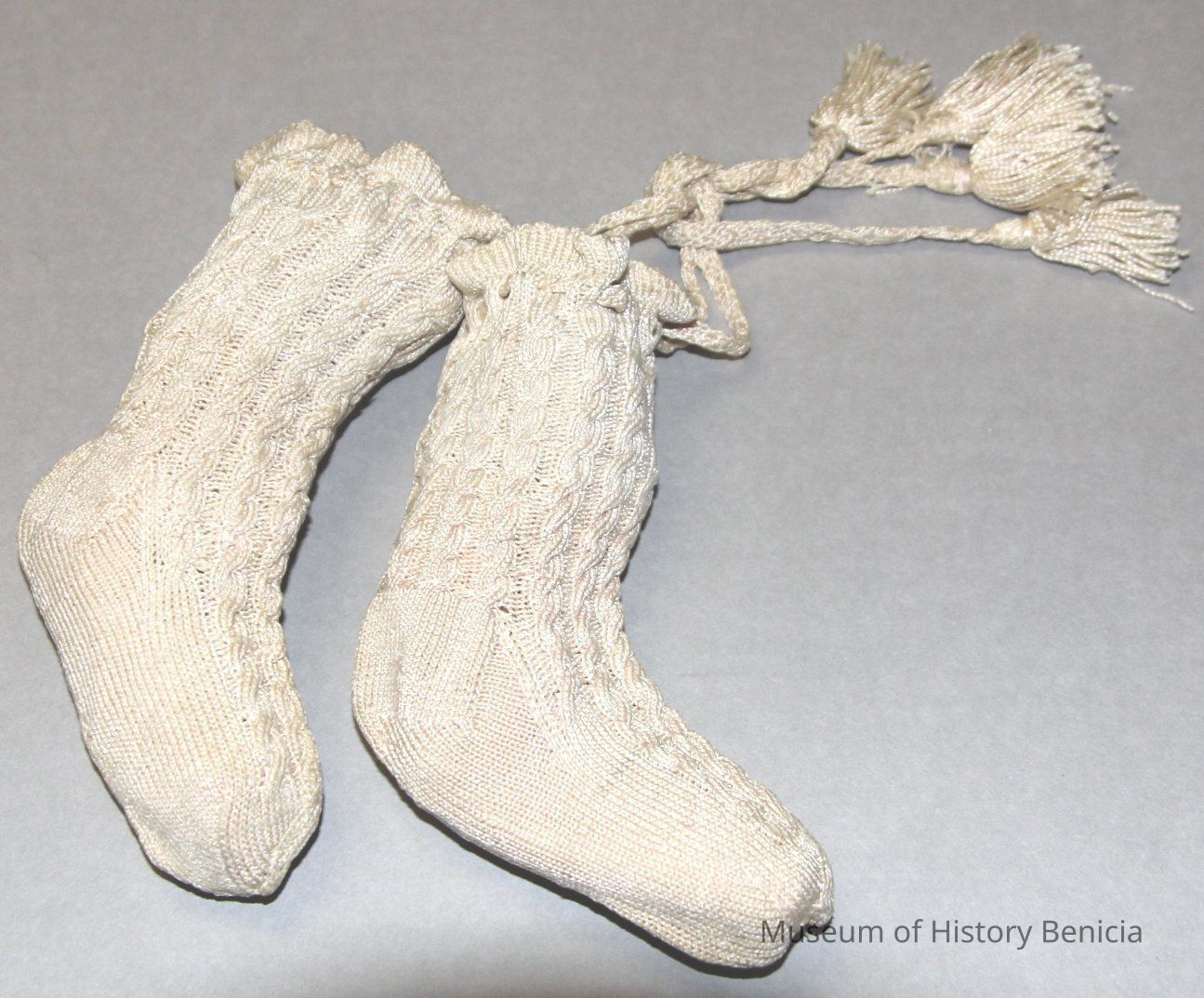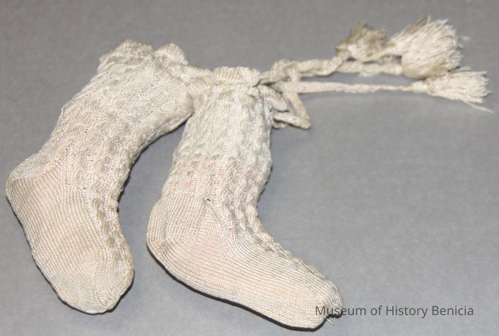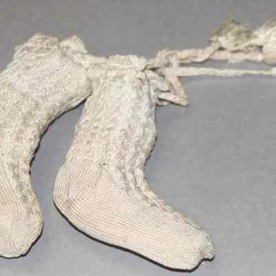 Pair of knitted baby Bootees. Faded pink, cable stretch, ties with tassel.