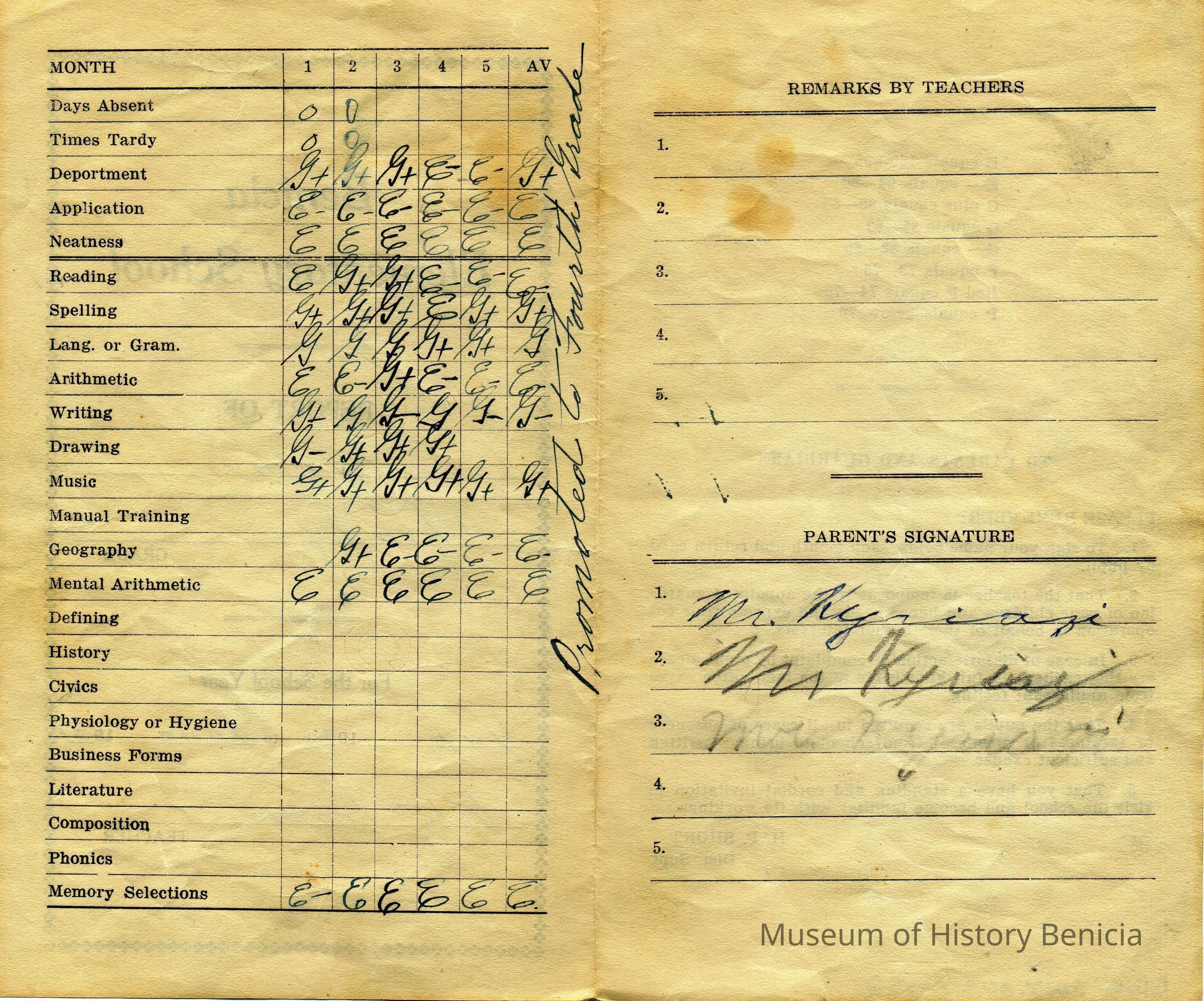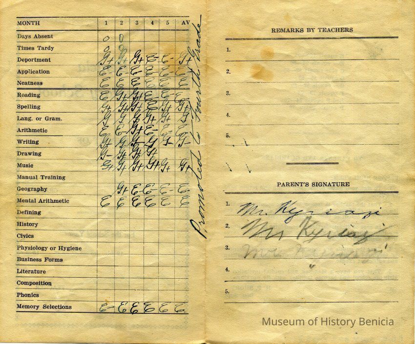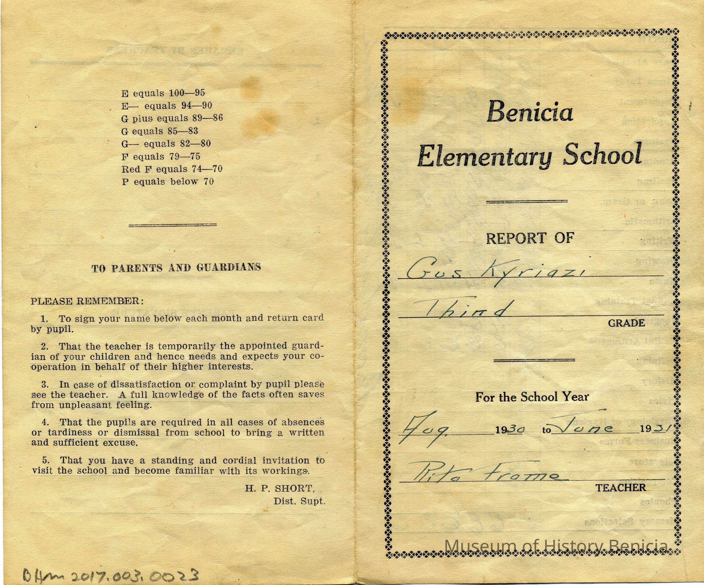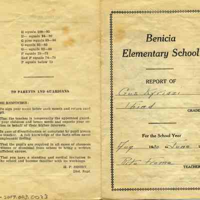 This is a report card for Gus Kyriazi from Benicia Elementary school for 1931 when he was in the Third grade. The teacher was Rita Frame.Collection