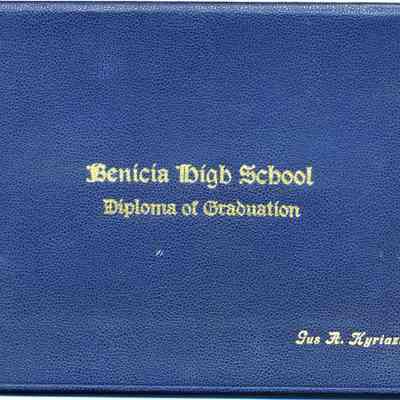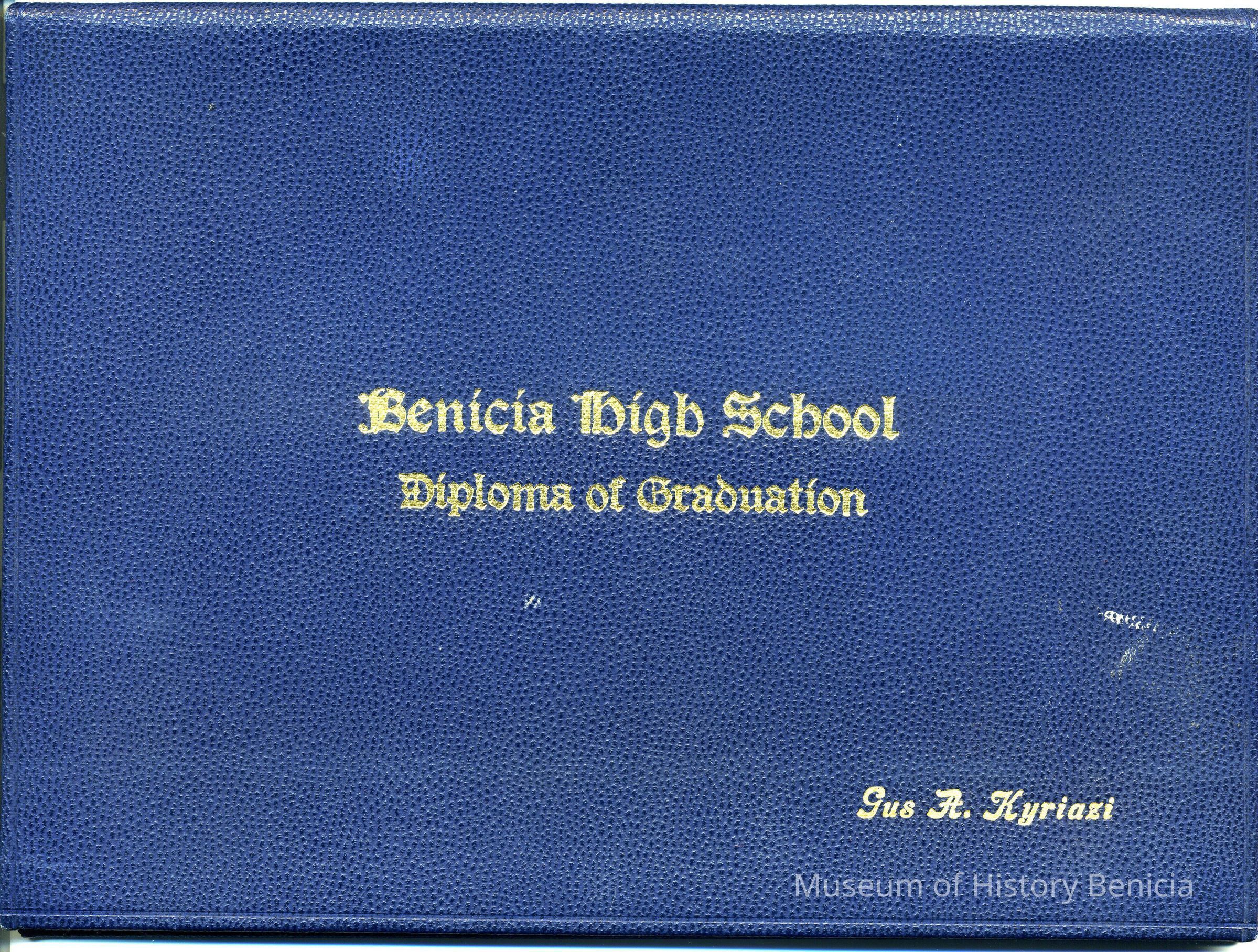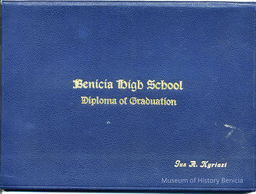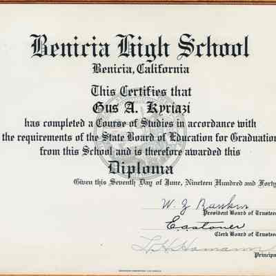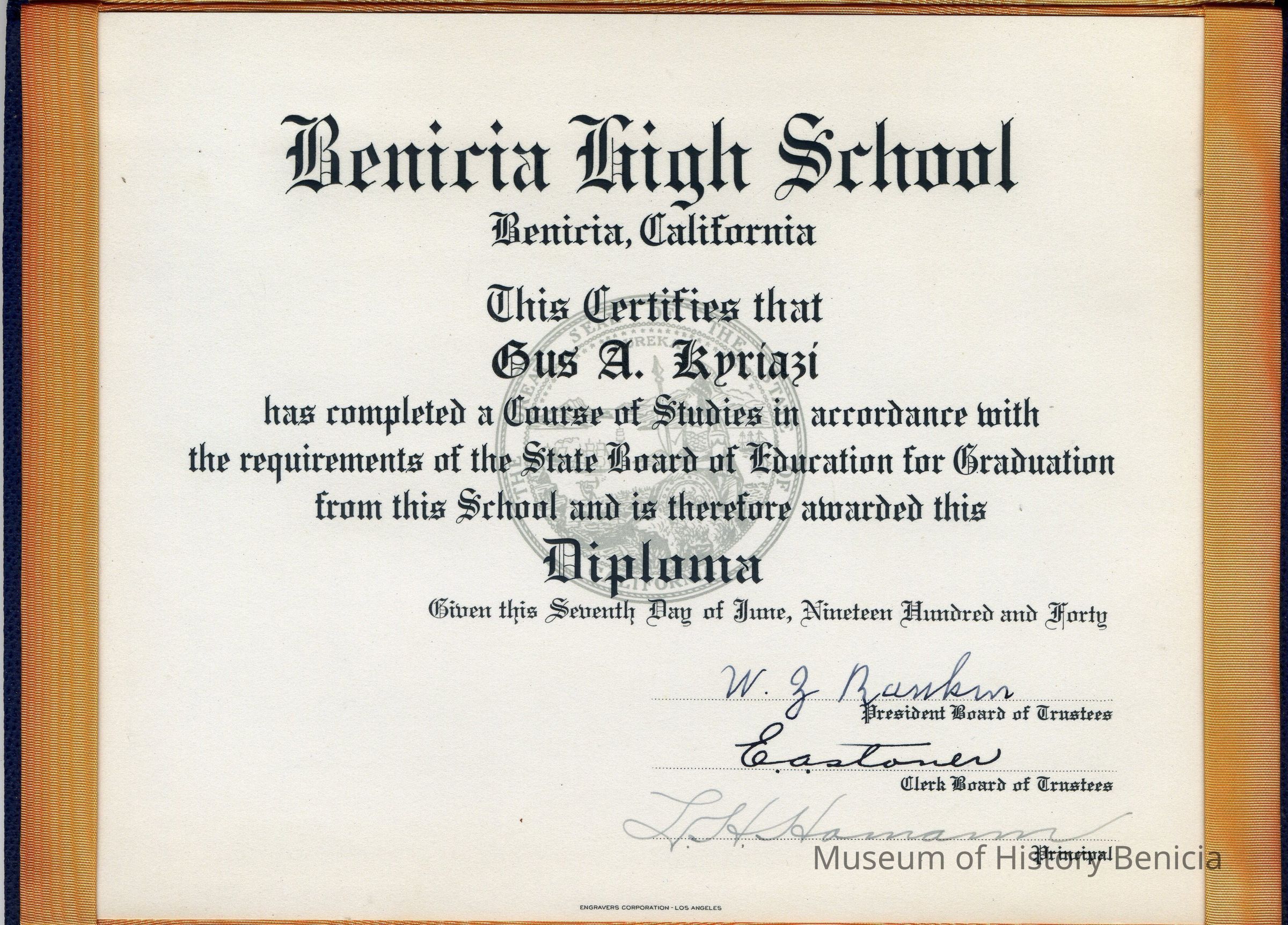 This is a high school di[ploma for Gus A. Kyriazi from Benicia High School in 1940. It is signed by W.Z. Rankin (President of Board of Trustees), E.A. Stoner (clerk Board of Trustees) and L.H. Hamamn (Principal).Collection