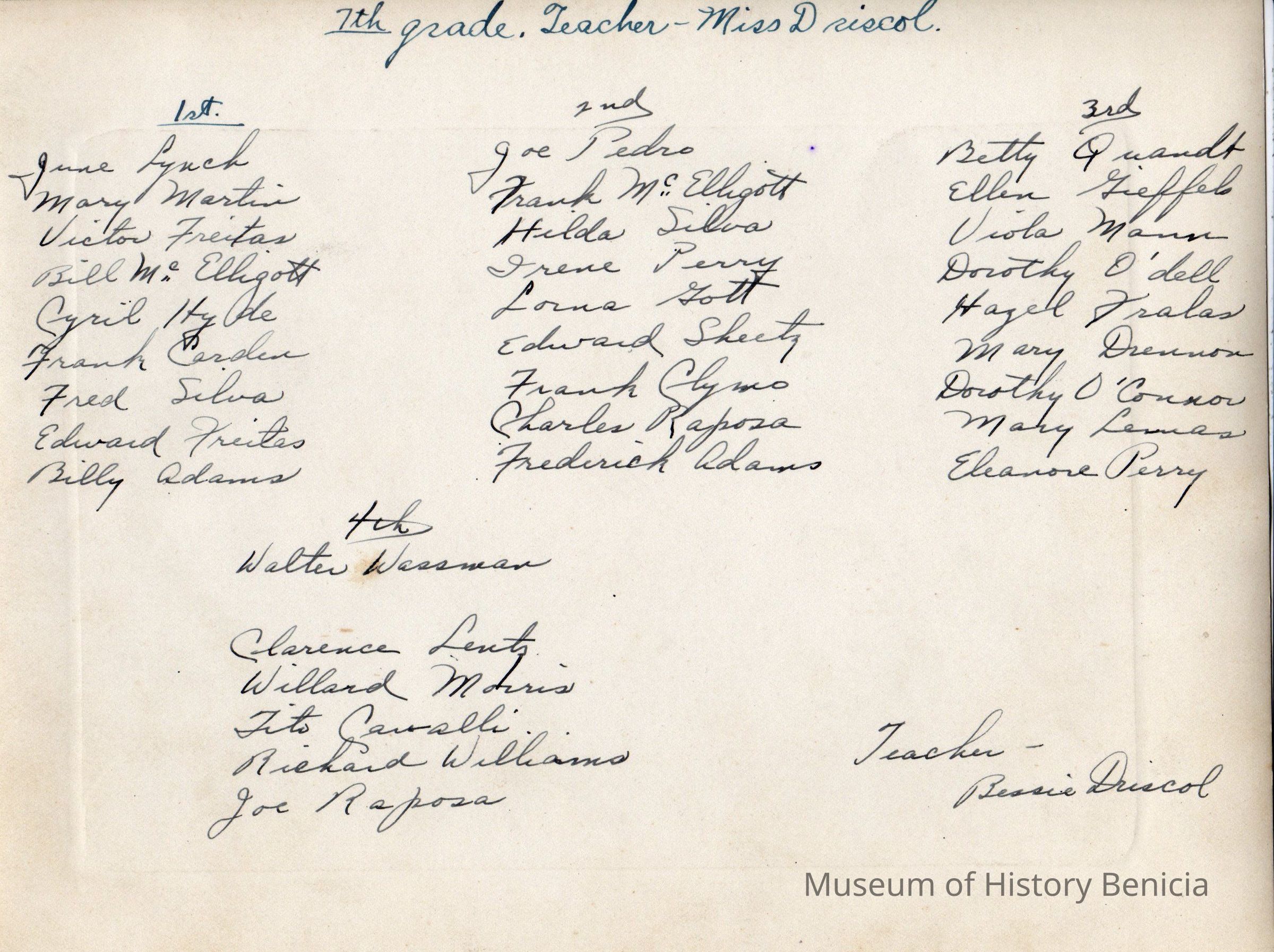 Photograph of Benicia 7th grade students in Miss Bessie Driscol's class 1927