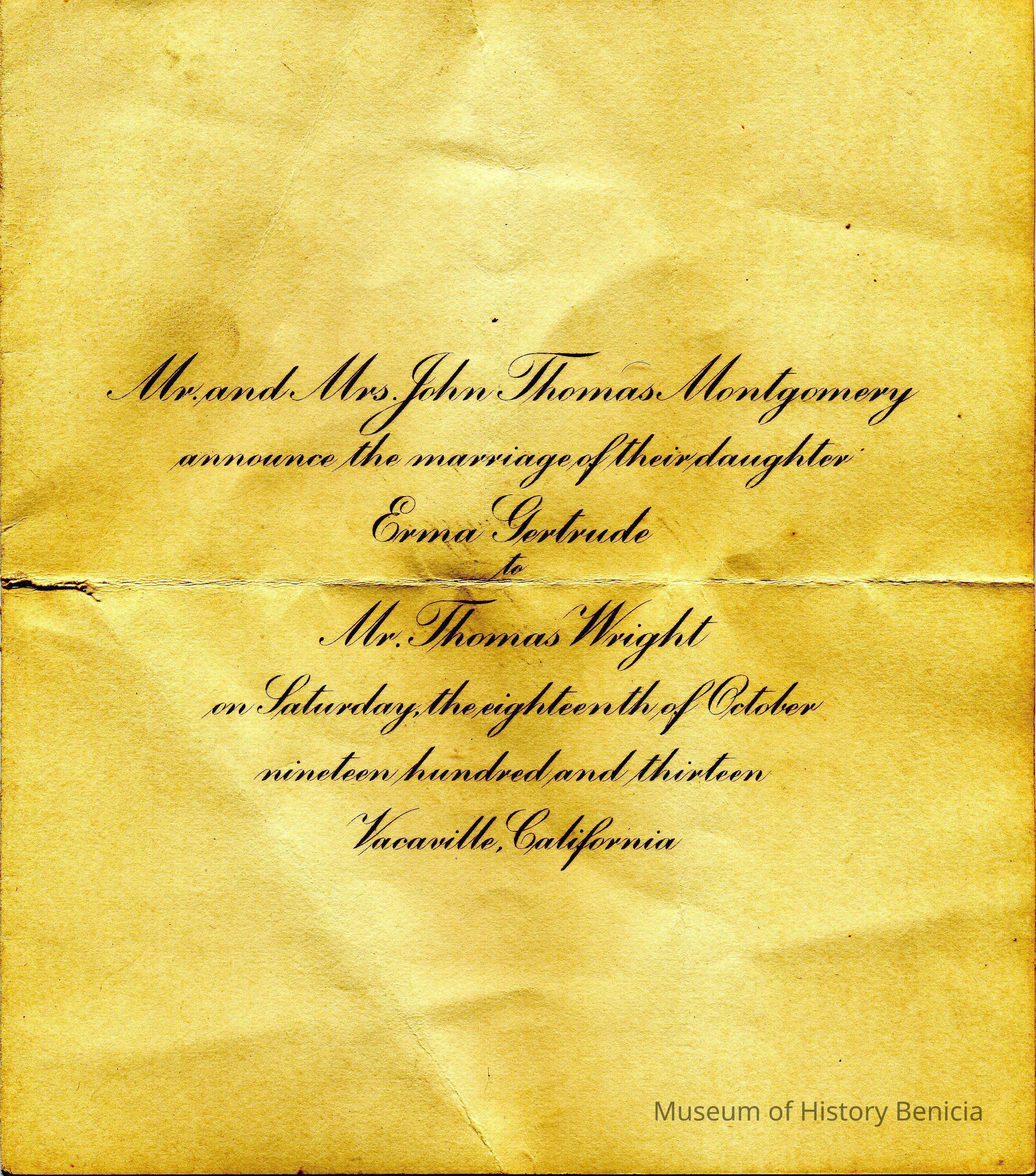 Announcement of the marriage of Erma Gertrude Montgomery, daughter of Mr. and Mrs. John Thomas Montgomery and Mr Thomas Wright. The marriage date is 10/18/1913 in Vacaville, Ca.Collection