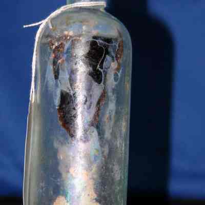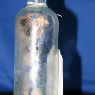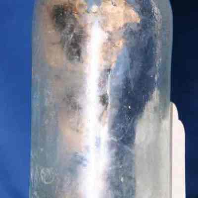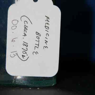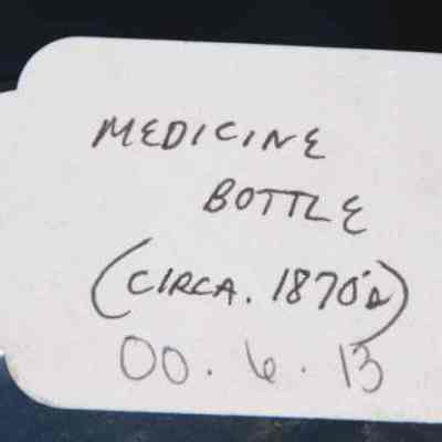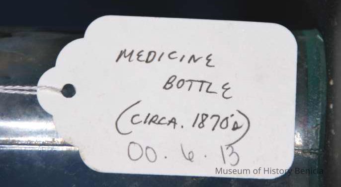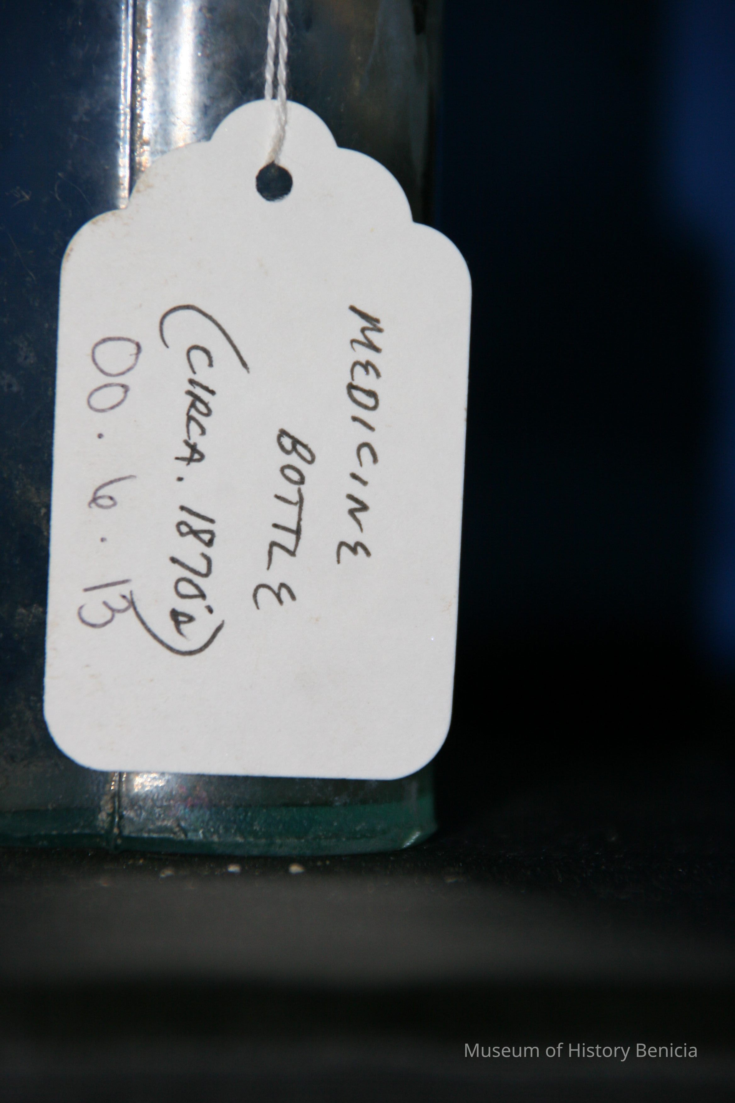 Glass medicine bottle found at Benicia Barracks site; found near current site of the National Guard Armory on Hillcrest Avenue in Benicia.