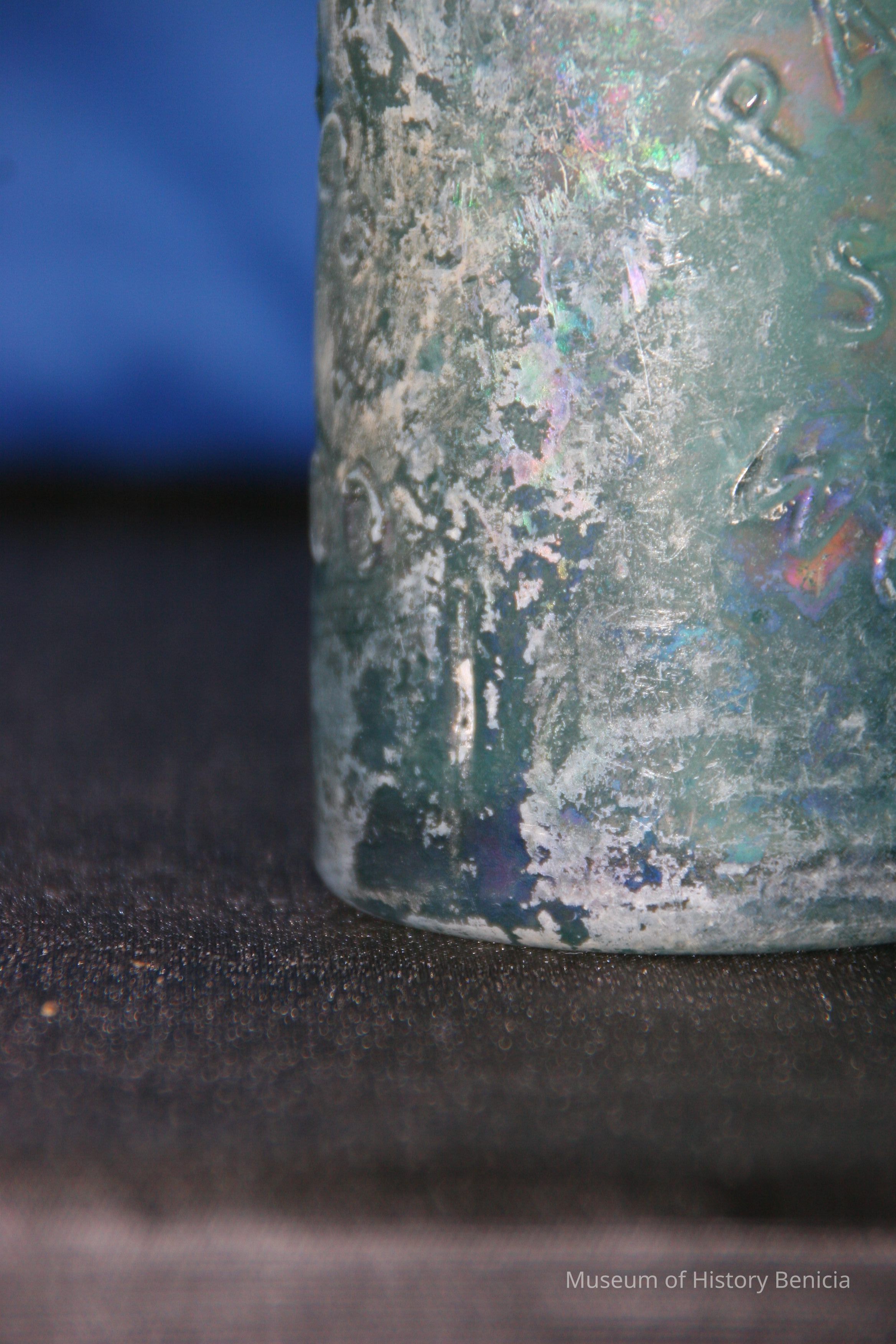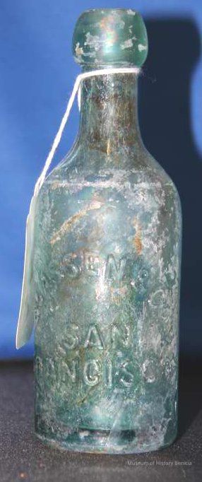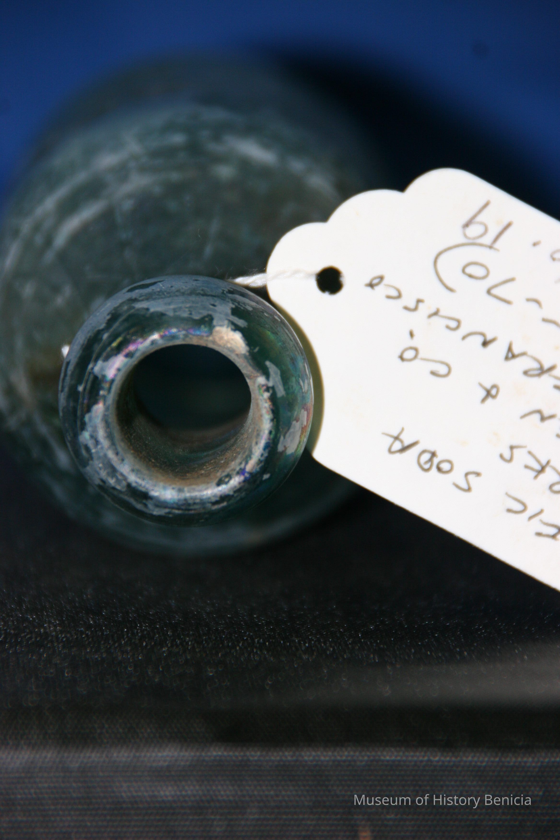 Glass soda water bottle found at Benicia Barracks site; found near current site of the National Guard Armory on Hillcrest Avenue in Benicia.