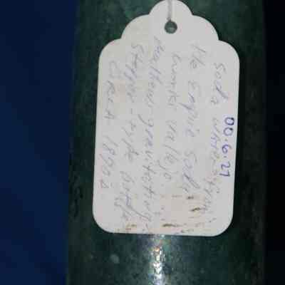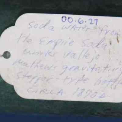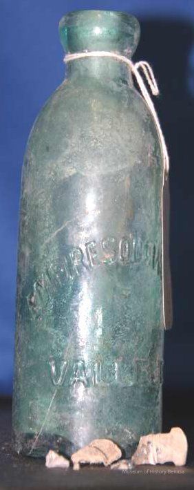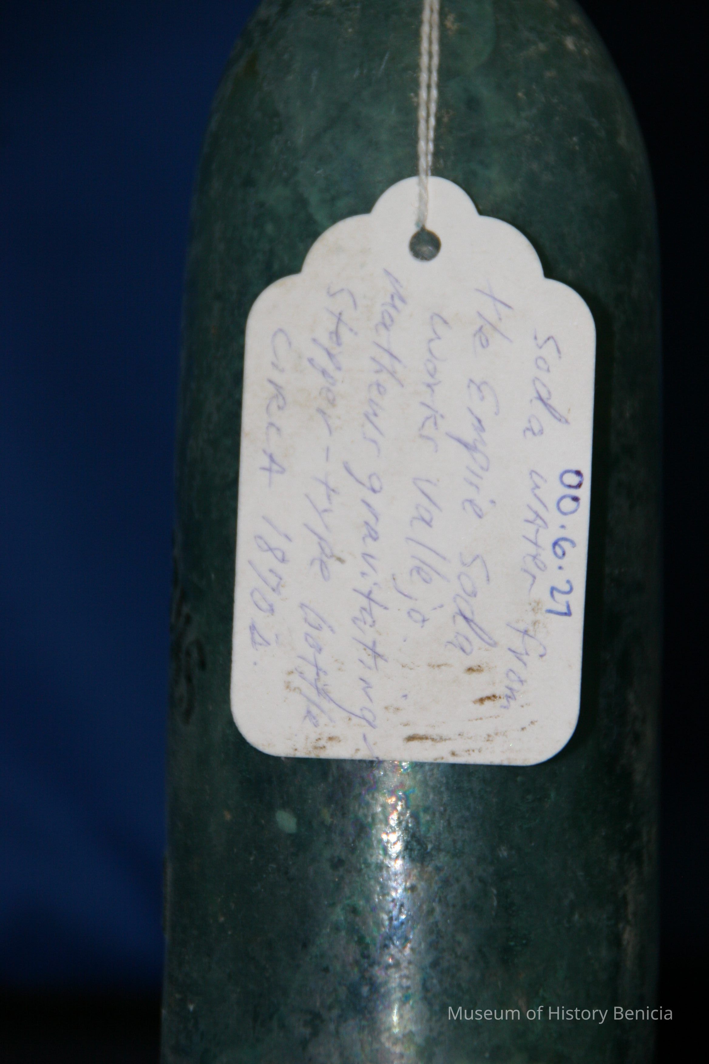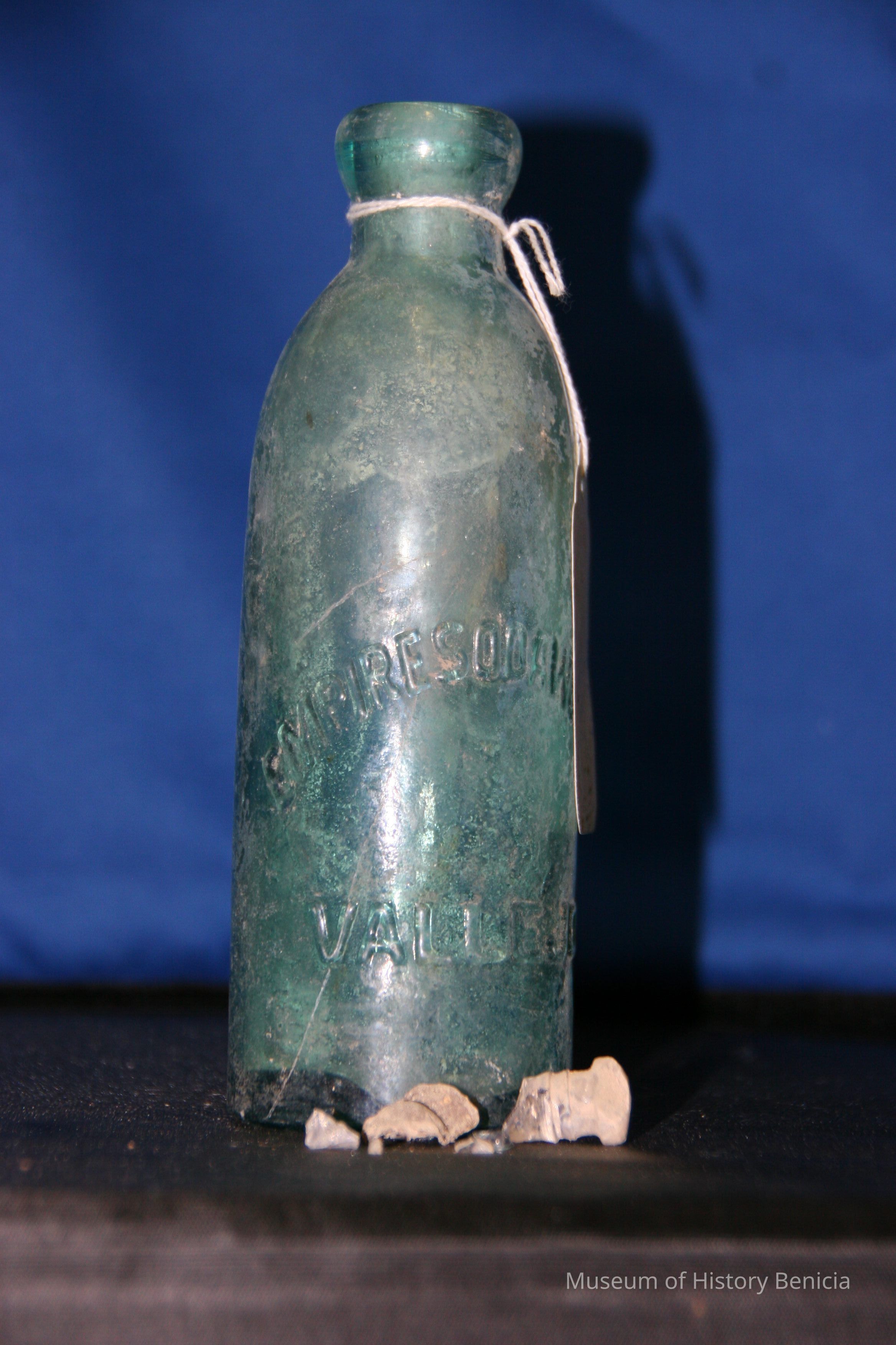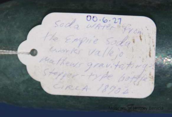 Blue-green with "Empire Soda Works Vallejo" on side. Empire Soda Works was located on northwest corner of Florida & Sonoma Streets in Vallejo. Bottle is Mathews gravitating-stopper-type bottle, has broken lip. (The broken stopper is inside the bottle.)Collection