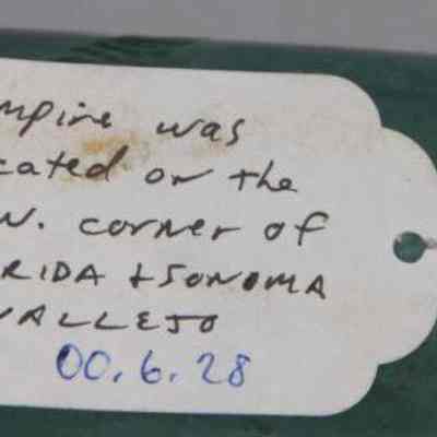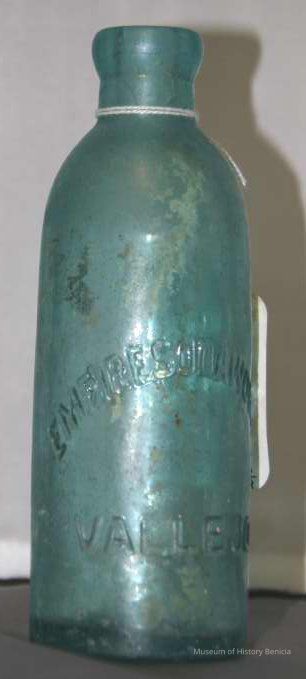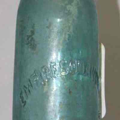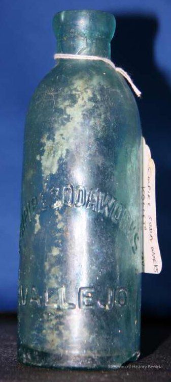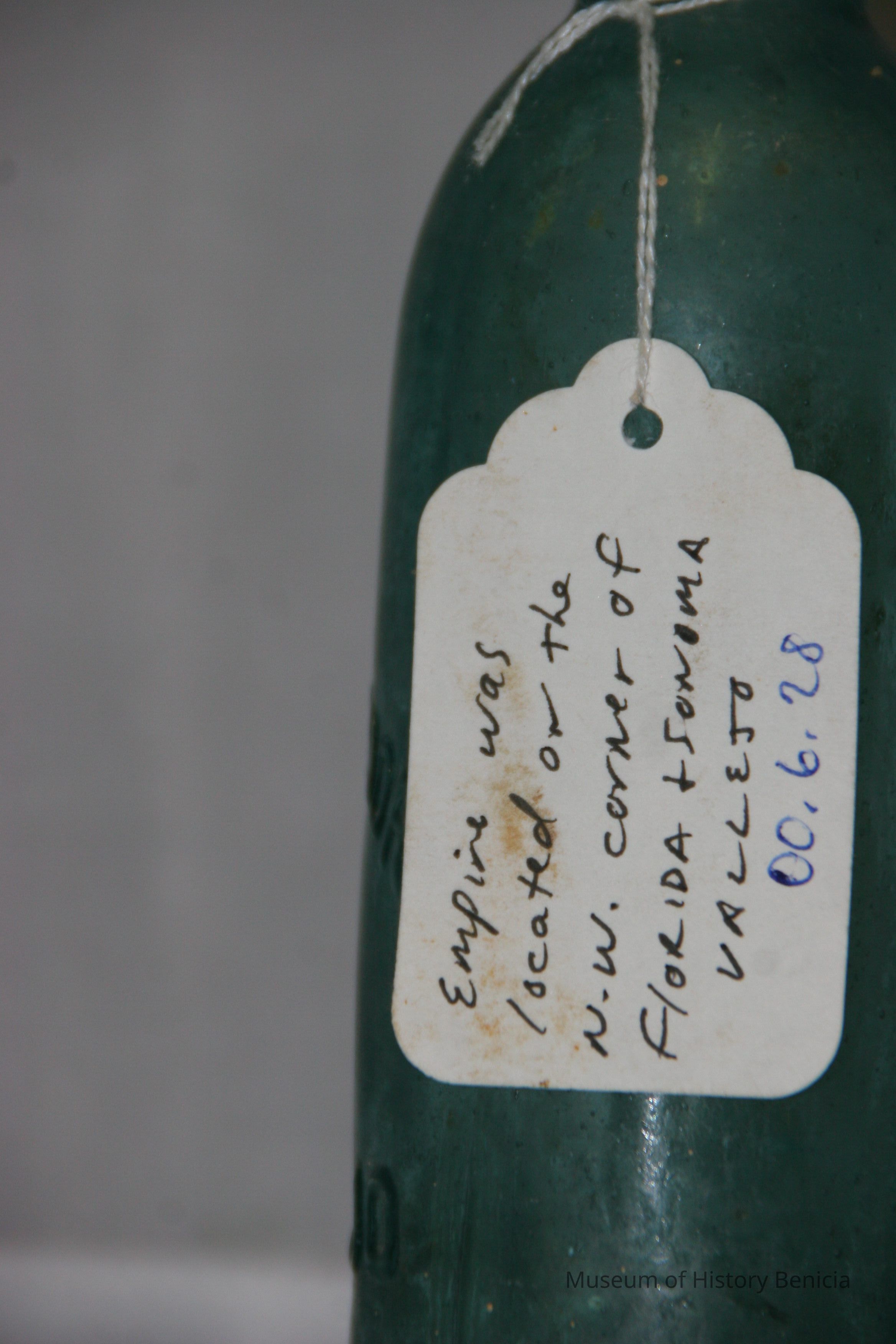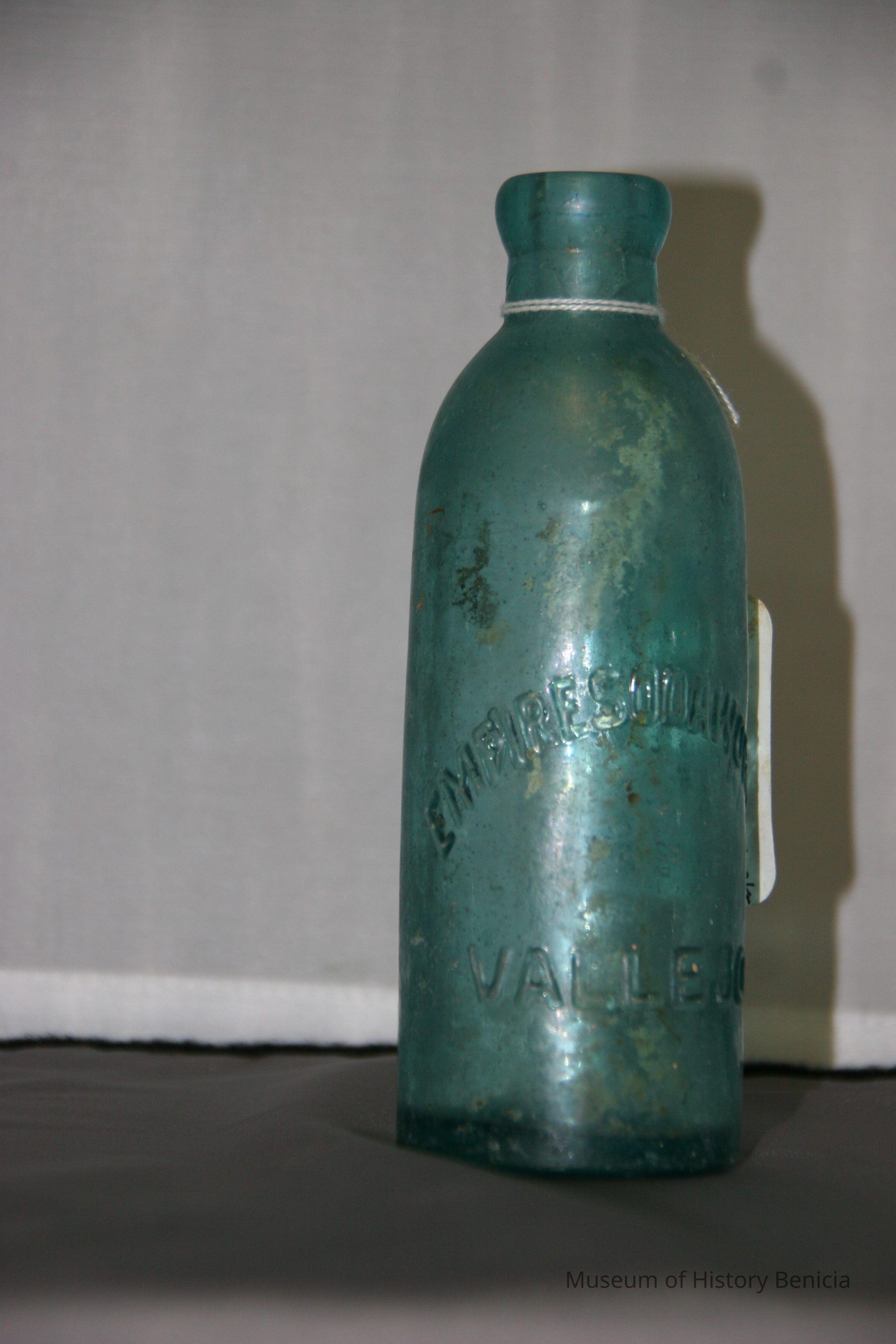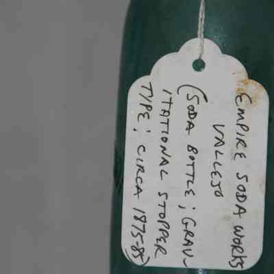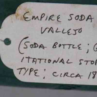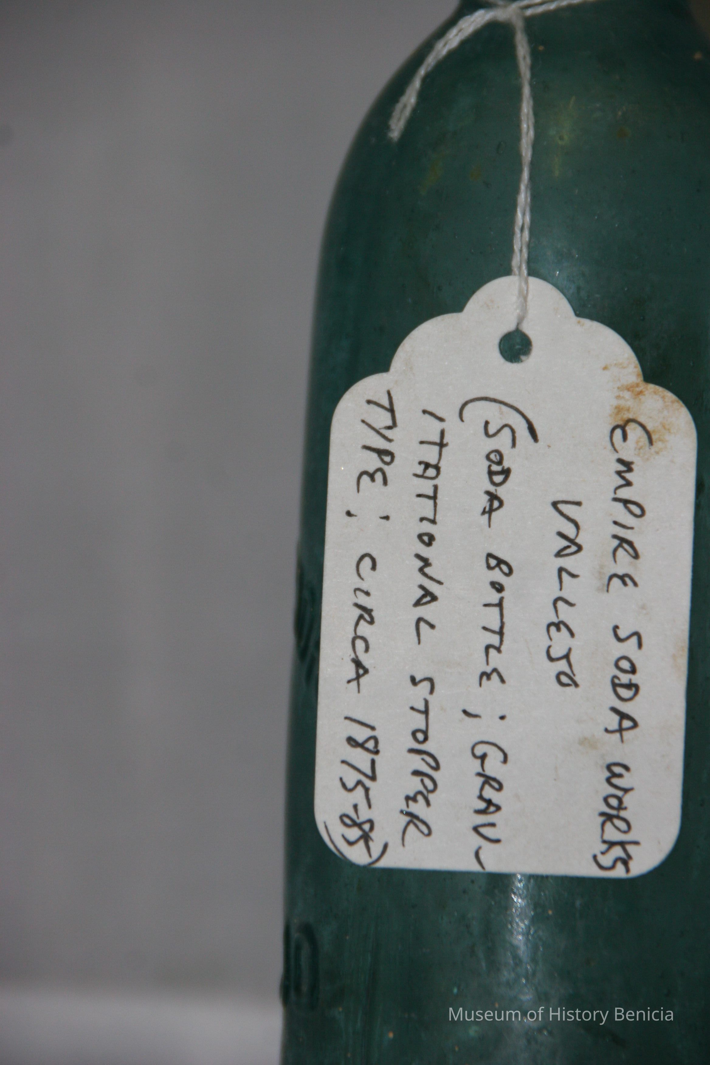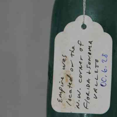 Pale blue-green with "Empire Soda Works Vallejo" on side. Empire Soda Works was located on northwest corner of Florida & Sonoma Streets in Vallejo. Bottle is Mathews gravitating-stopper-type bottle, has severely chipped bottom.Collection