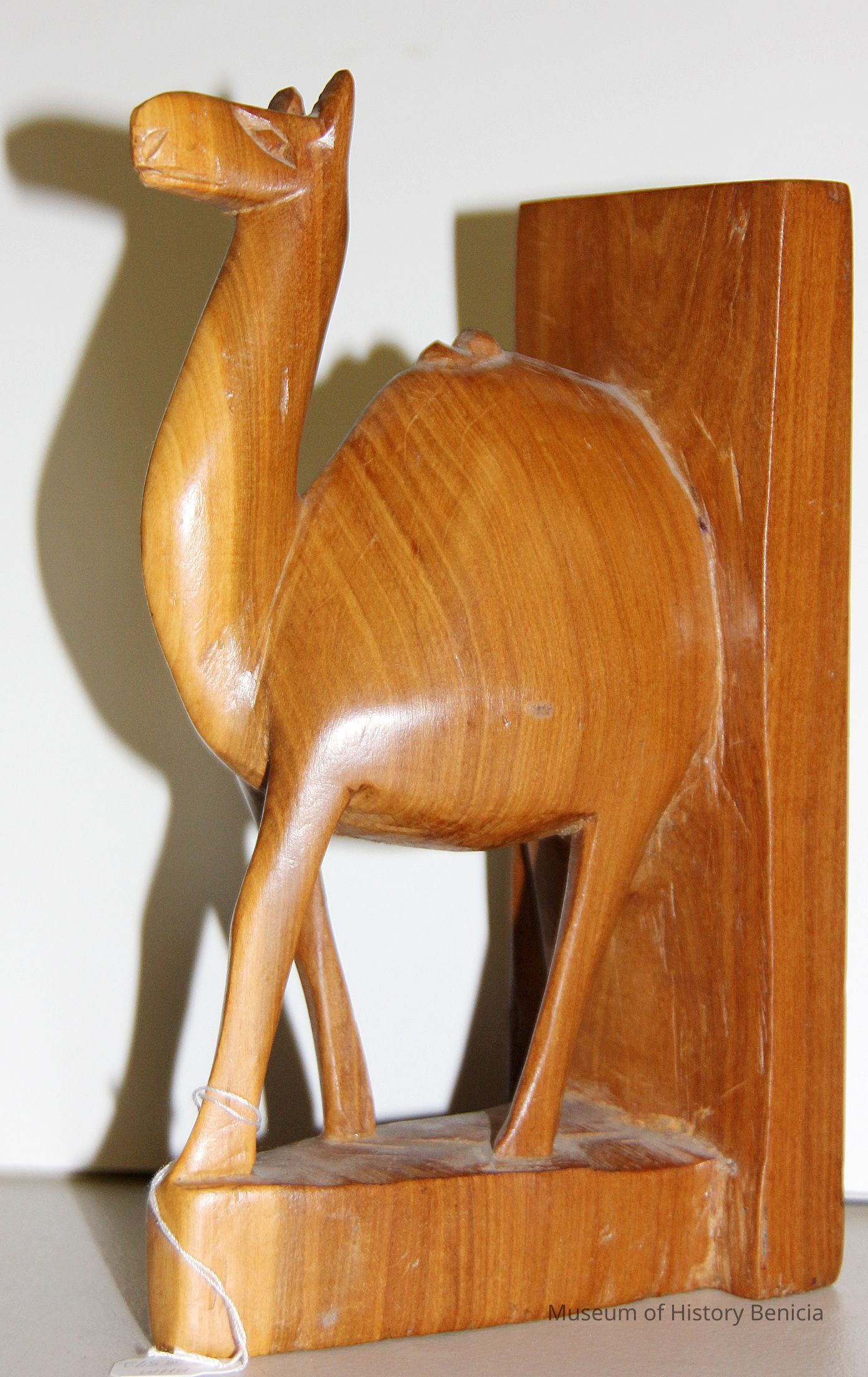 Wooden bookend showing front part of a camel.