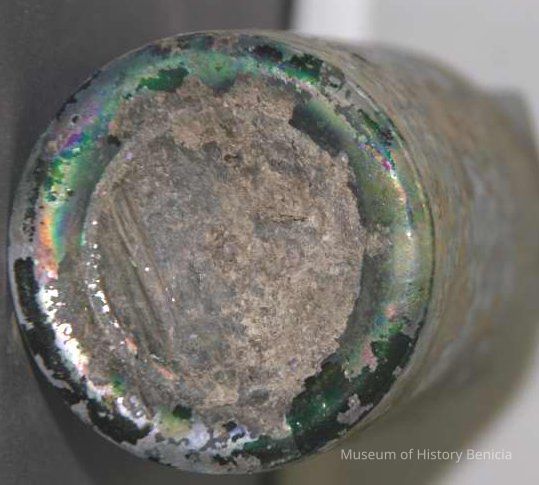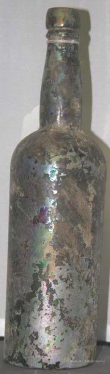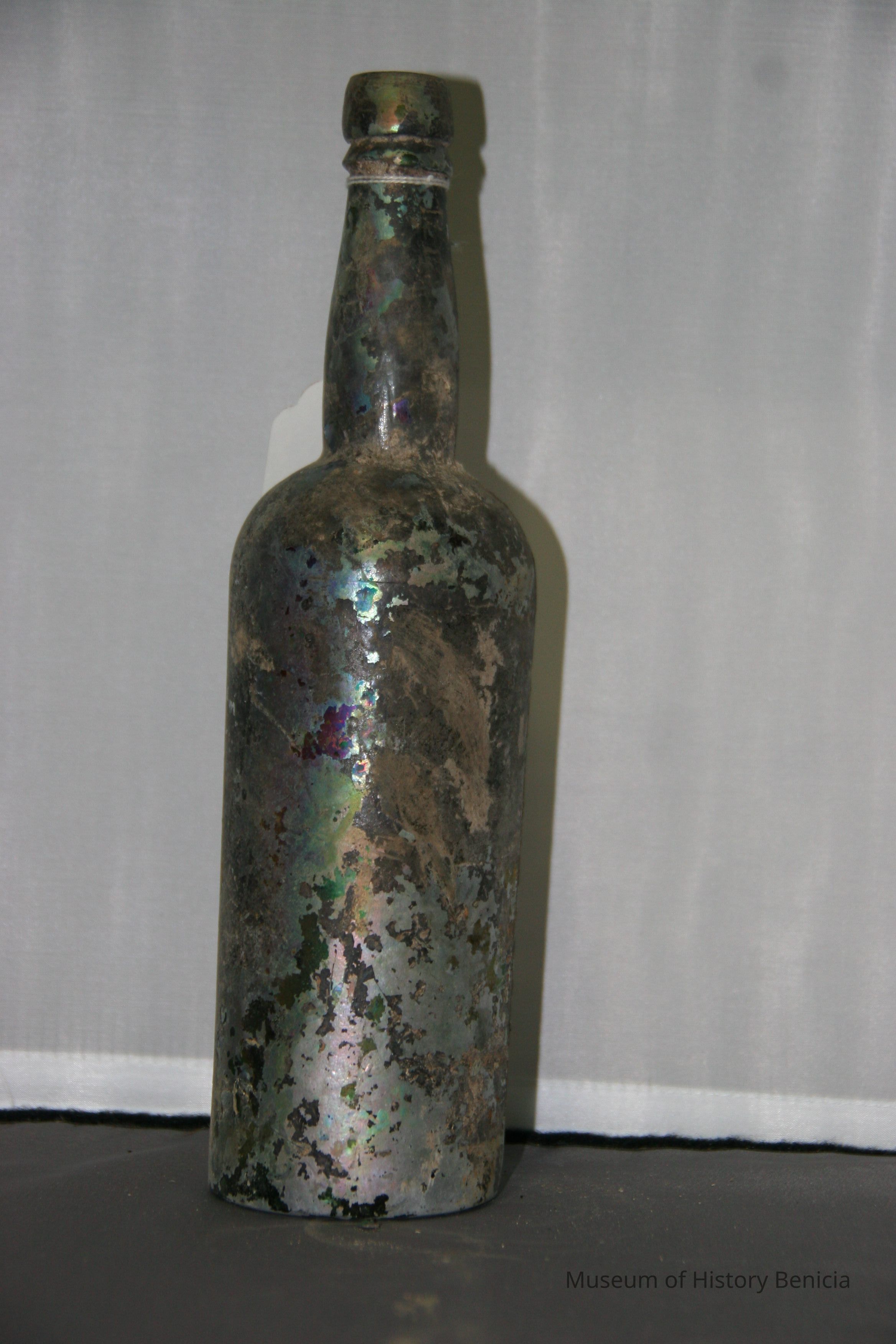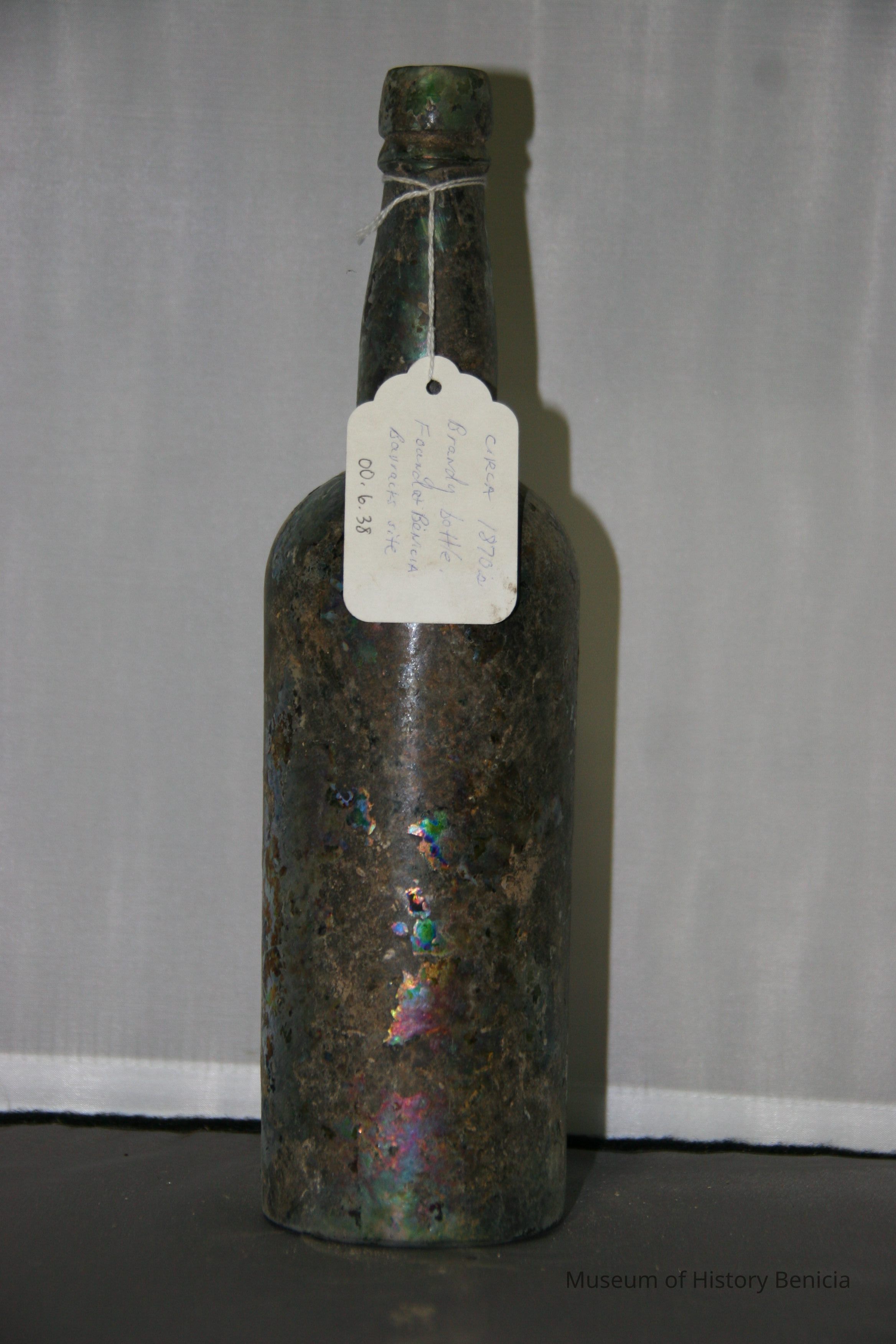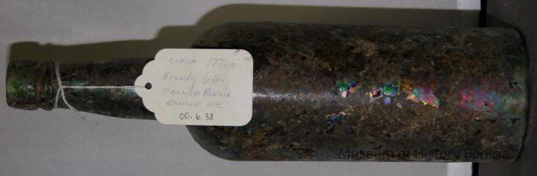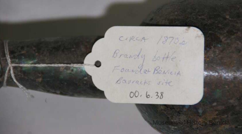 Glass Brandy bottle found at Benicia Barracks site; found near current site of the National Guard Armory on Hillcrest Avenue in Benicia.