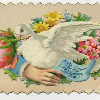 Front: Cutout: Dove with a rose in its beak resting on a hand;