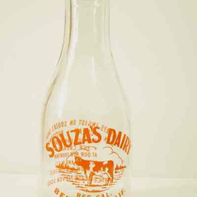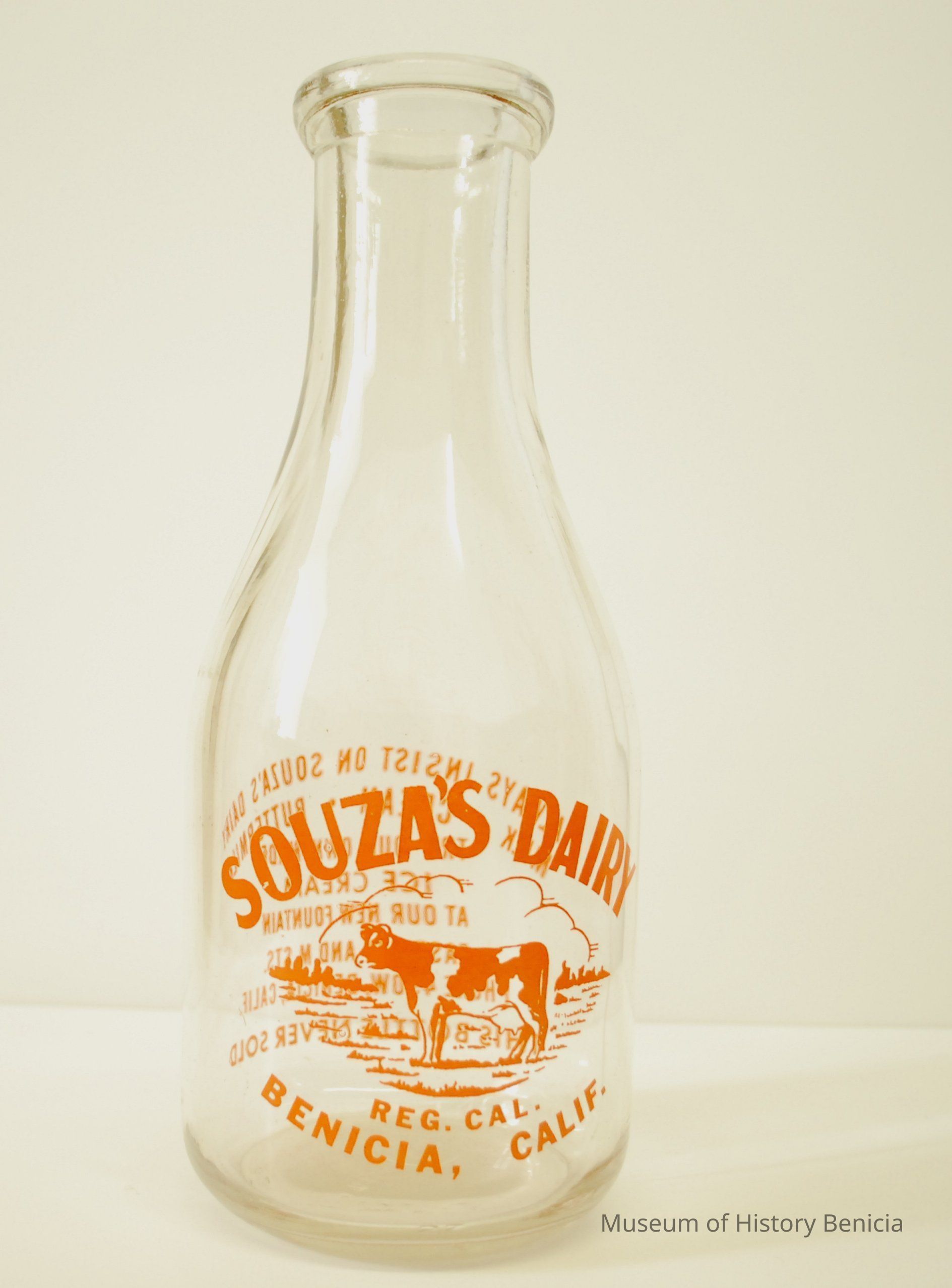 Glass bottle, labeled "Souza's Dairy" in orange on one side; below that is a picture of a cow in a field and "Reg. Cal./Benicia, Calif." On opposite side is advertisement for Souza's Dairy.Collection