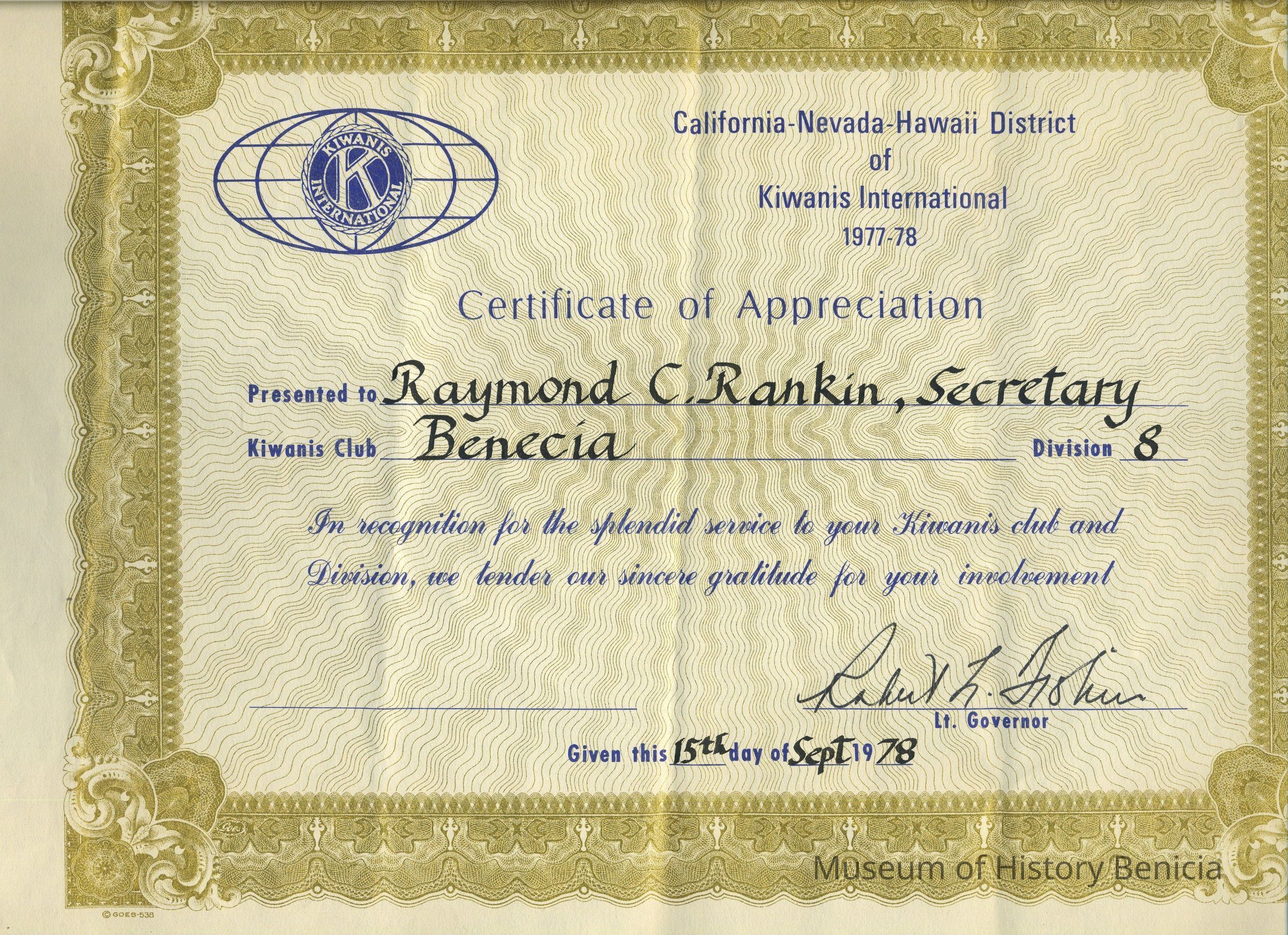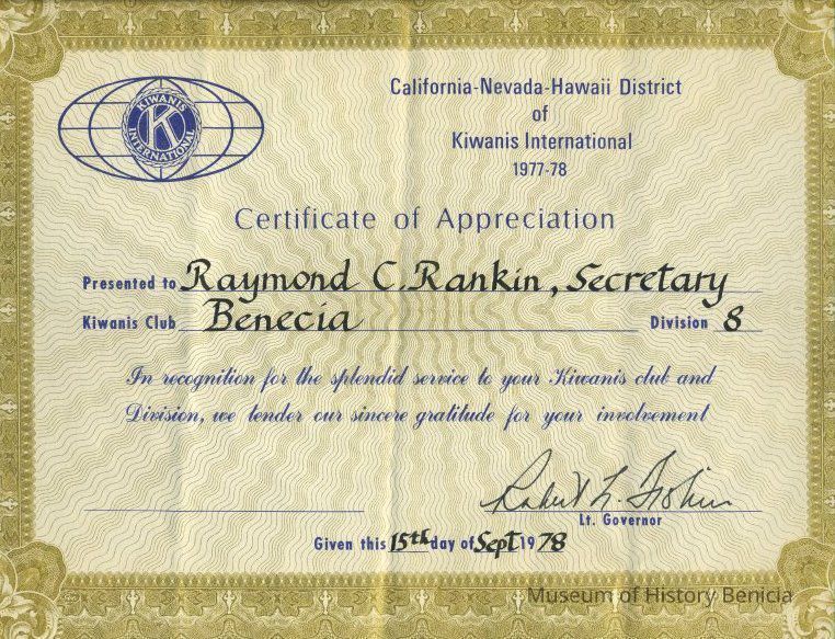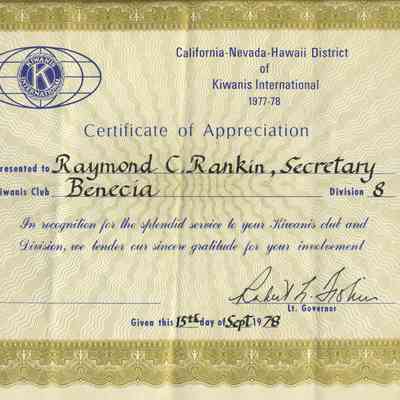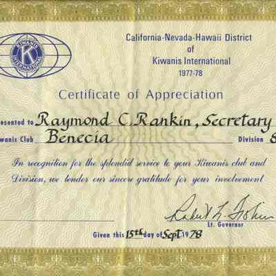 Certificate - Appreciation from California-Nevada-Hawaii District of Kiwanis International 1977-78 presented to Raymond C. Rankin, Secretary; Benicia, Division 8, "In recognition for the splendid service to your Kiwanis club and Division, we tender our sincere gratitude for your involvement." signed by Lt. Governor on 15th day of Sept. 1978.