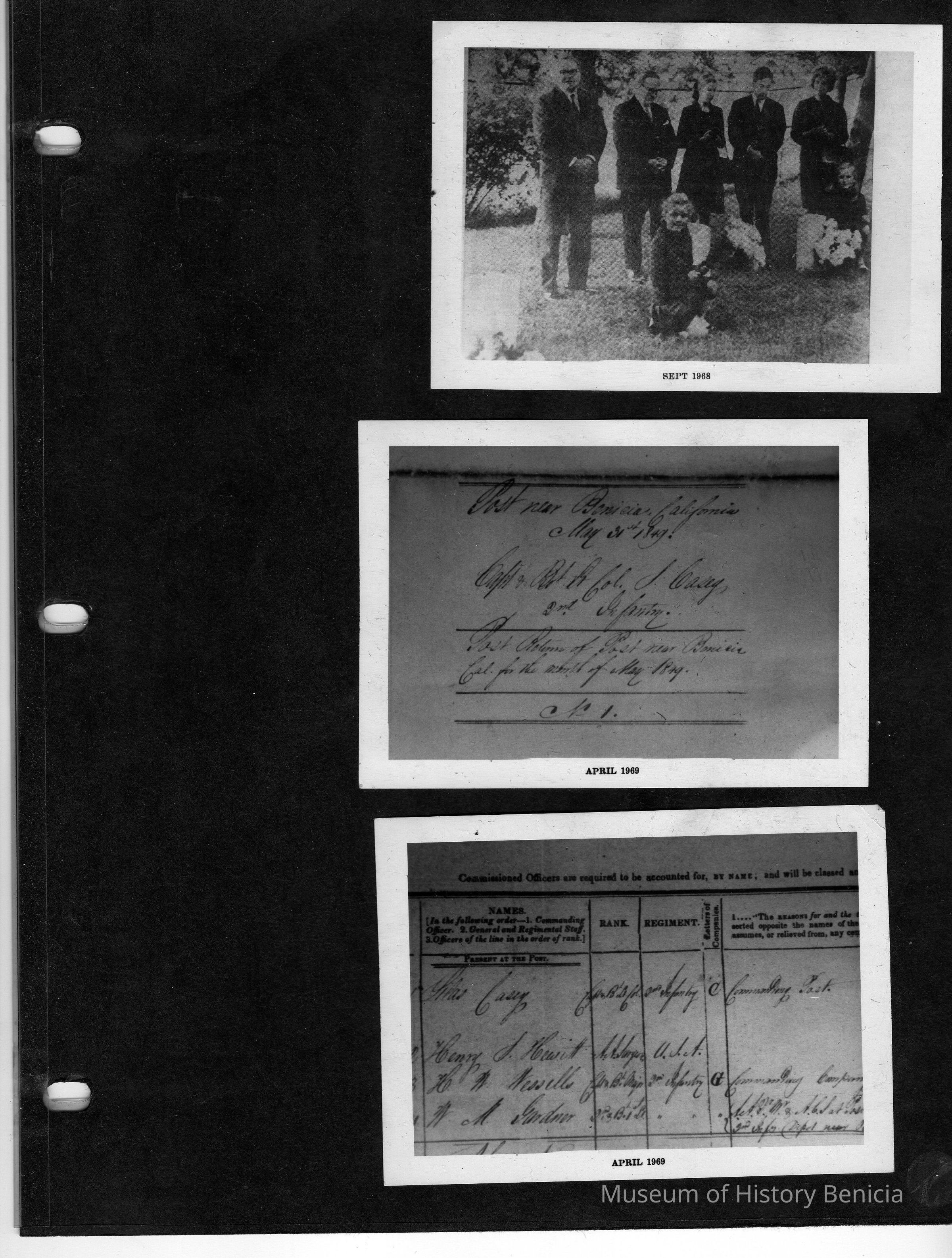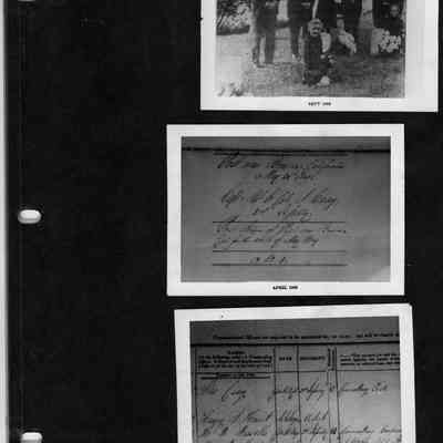 Page contains three B/W photos. Top shows a scene in a cemetery, the other two show pages from a ledger regarding an infantry man's assignment.Collection