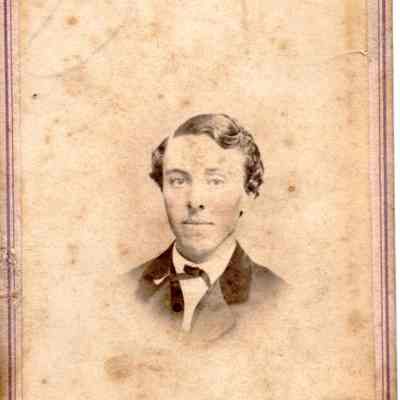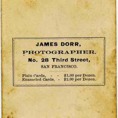 Carte-de-Visite photo of a man. It is in a studio. It came from a photo album of portraits with some photos with names of subjects. Family names: Durrant, Pfister, Dalton, Reynolds, Booth, Gucker. Album is covered in red plush. This photo has no name written under the photo. It was taken in San Francisco by James Dorr