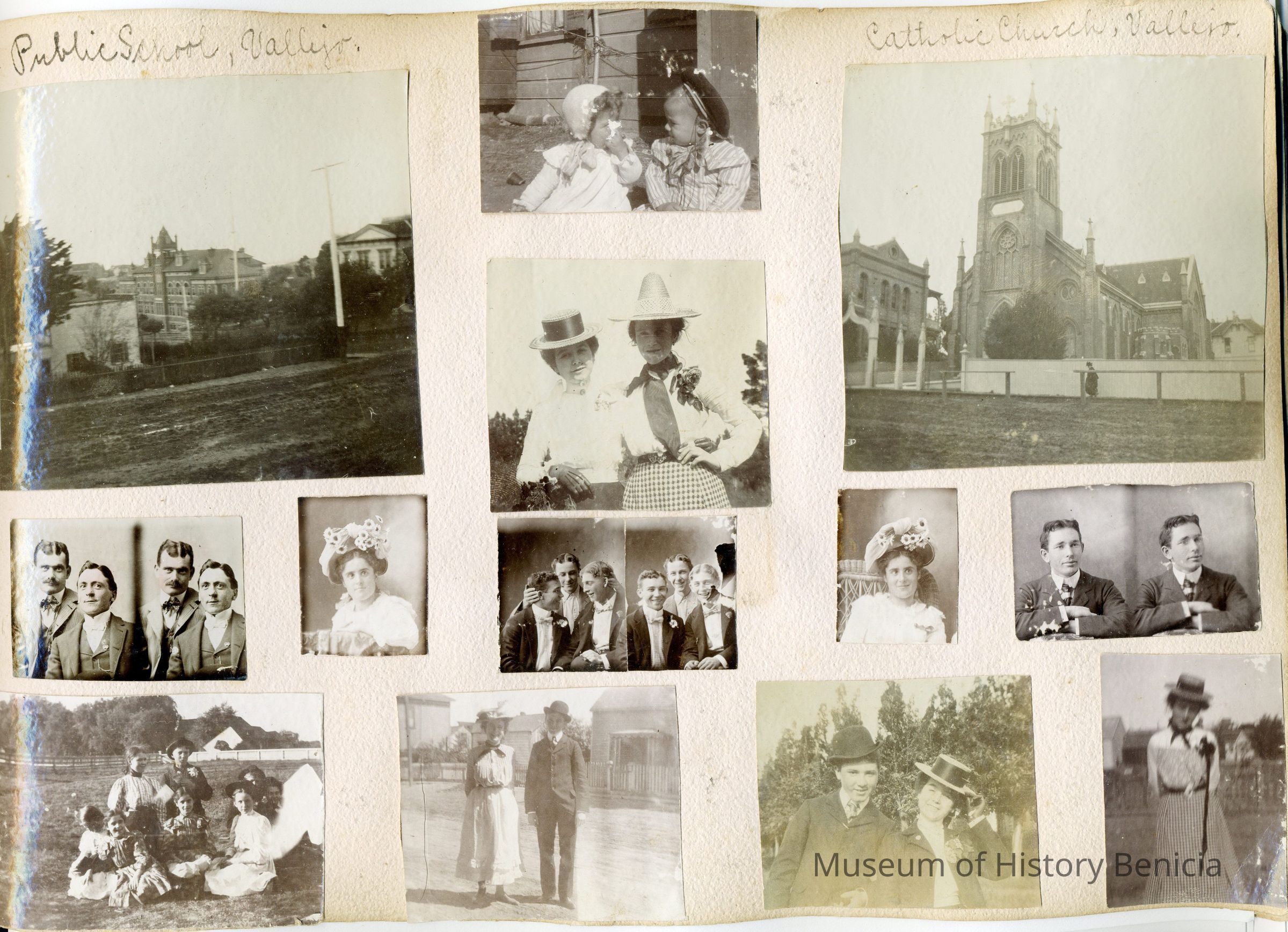 Photo album originally belonging to Allerta Ives (04/1884 - 05/31/1954) of Benicia. Contains mostly pictures of owner's family and friends, but also contains some views of Benicia. Alberta Ives father was Edward H Ives (1858/1863) who in 1900 was a professional studio photographer in Benicia (EH Ives Art Studio). Alberta worked as a teacher in Alameda before marrying Walter M Christie about 1913.