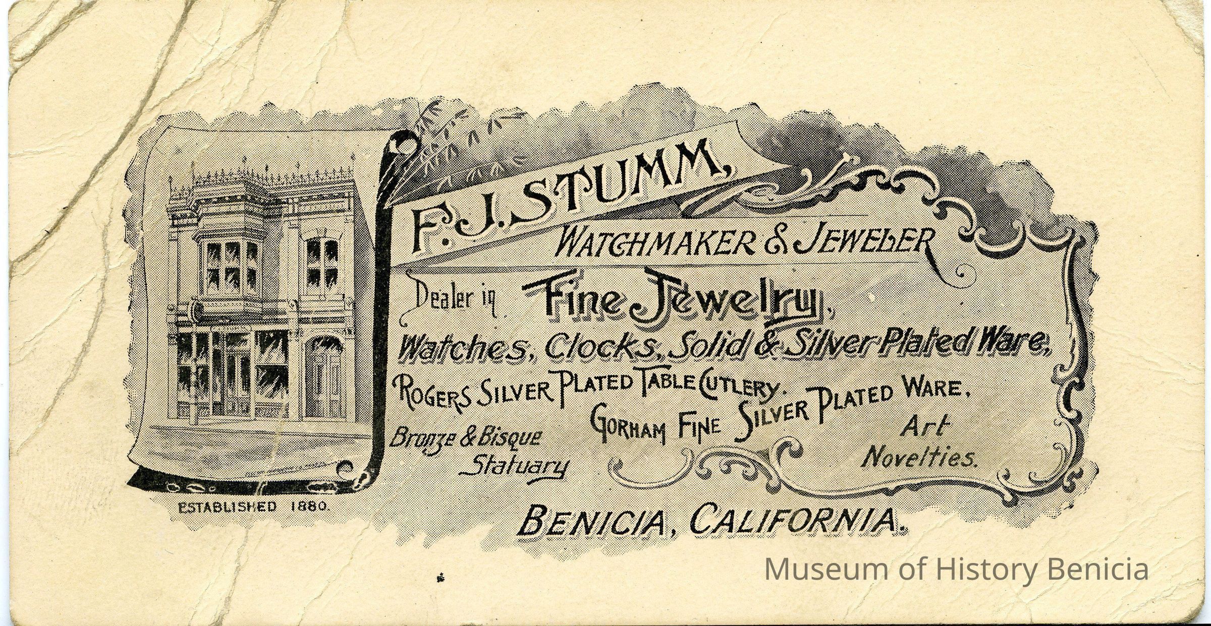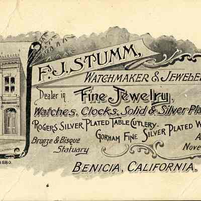This is a small card advertizing the F.J. Stumm Jewelry store in Benicia. One side list the birth stones for each month. The other side has a drawing of the store and the note "established 1880".Collection