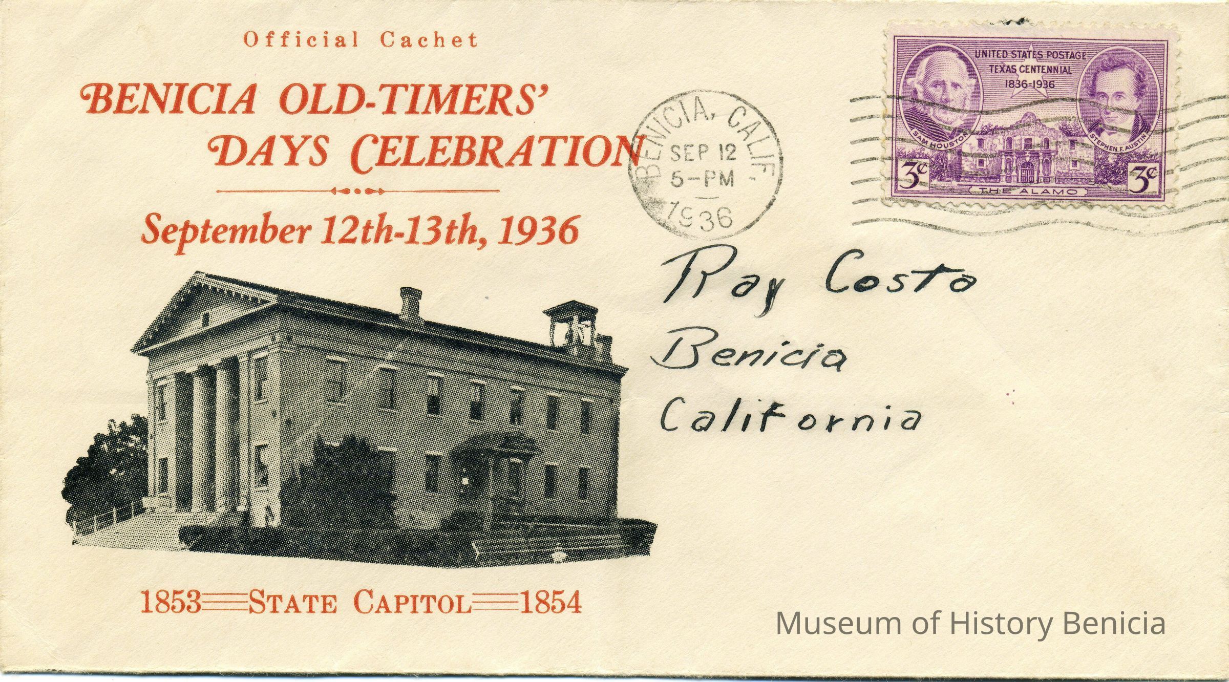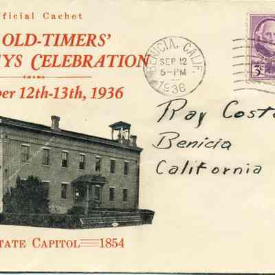 This is a First Day Cover for the September 1936 Benicia Old-Timer's Days Celebration. It was held on 09/12-13, 1936. An imprint of the Benicia State Capitol os on the fron with the caption "1853 =State Capitol=1854. The letter is addressed to Ray Costa. There is a Texas Centeninal stamp on the letter.Collection