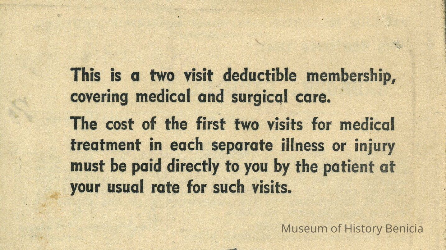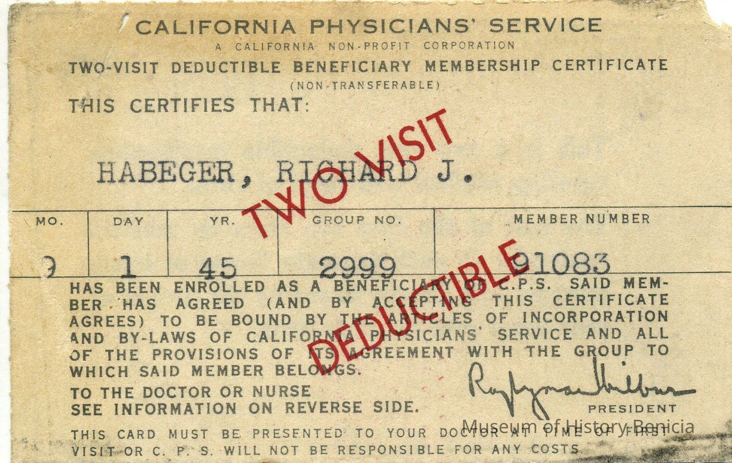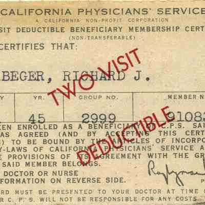 Medical Insurance Card for Richard J. Habeger dated 9/01/1945, group #2999, member #91083; The membership included a two visit deductible and coverage was provided by California Physician's Service, a non-profit corporation. On the back of the card for the doctor: "This is a two visit deductible membership, covering medical and surgical care. The cost of the first two visits for medical treatment in each separate illness or injury must be paid directy to you by the patient at your usual rate for such visits." 2-3/8" x 3-5/8"