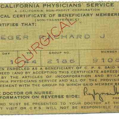 Medical Insurance Card for Richard J. Habeger dated 07/01/1944 group #2186, member #91083; Coverage was provided by California Physicians Service, a non-profit Corporation. On Back: "This is a Surgical Membership covering surgical operations (cutting procedures) under anesthesia, local or general, in or out of the hospital, and includes treatment for fractures and dislocations. Treatment of medical cases is not included."