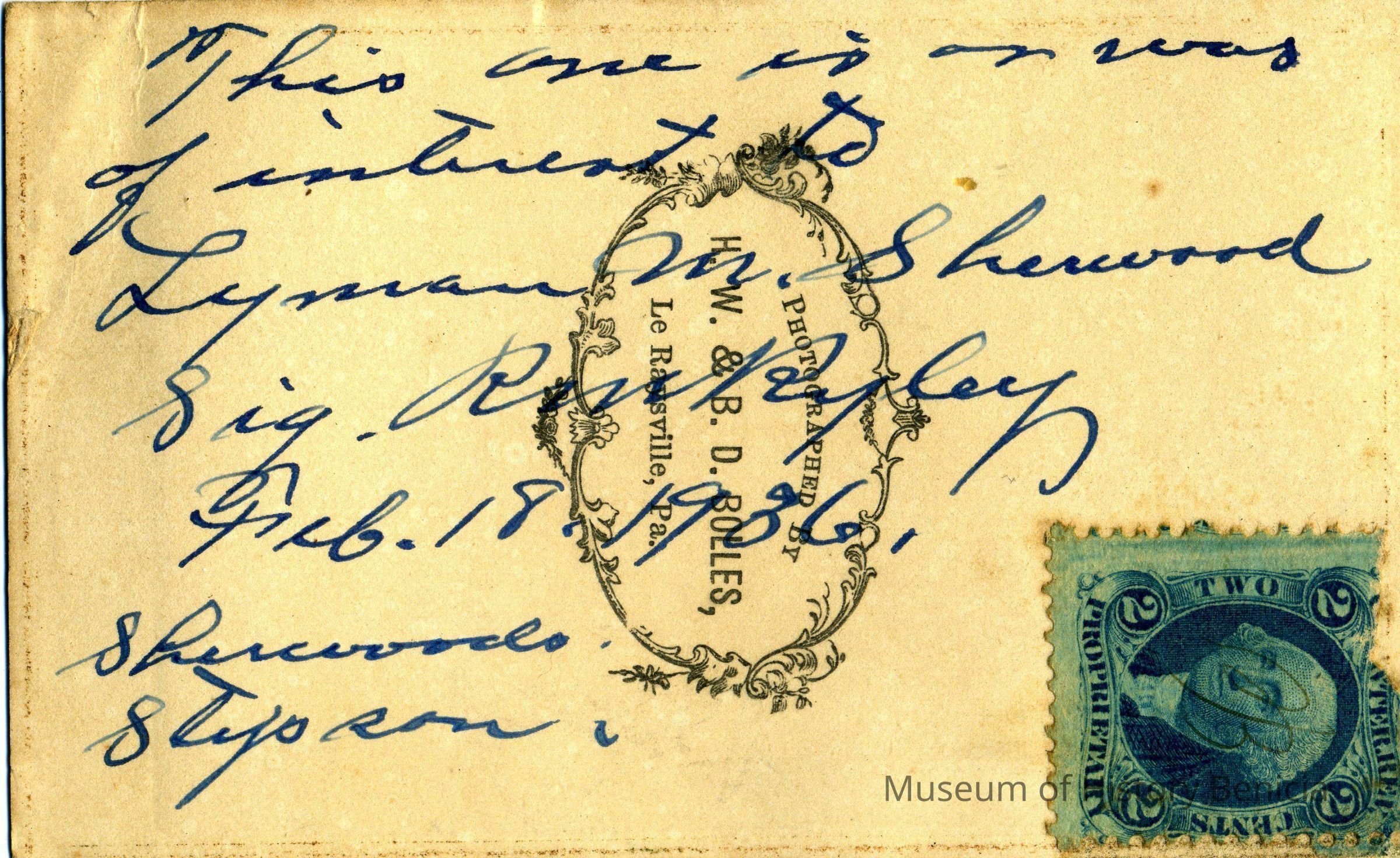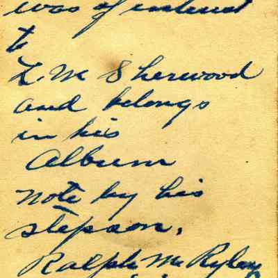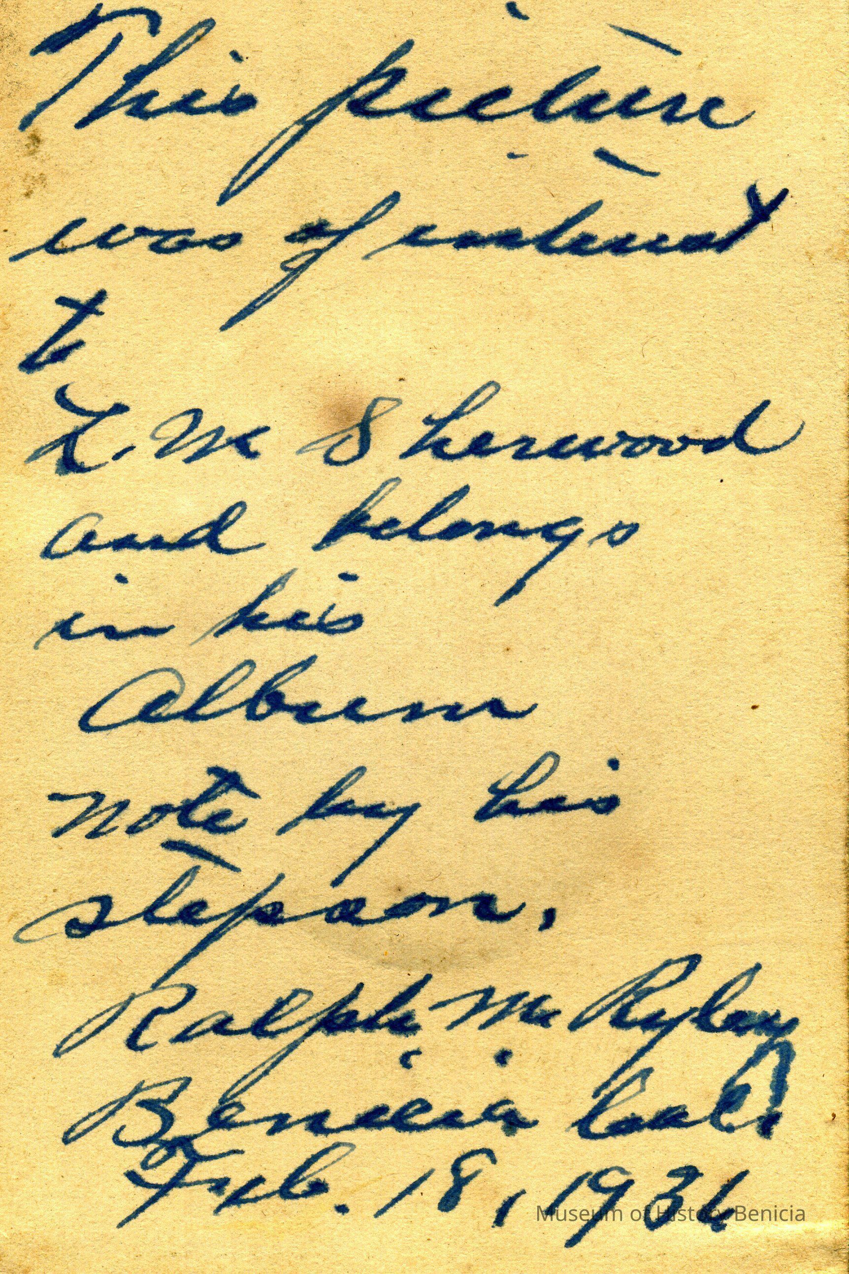 The captions shown in the album are in part based on information from Mr Sherwood's step-son, Ralph M. Ryley of Benicia California. Mr Ryley was the son of Emman Esther Snyder and George Washington Ryley, They divorced in 1883. Esther married Lyman Mumford Sherwood in 1897. Ralph M Ryley died in Benicia on 12/14/1943.Collection