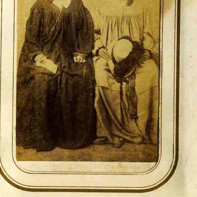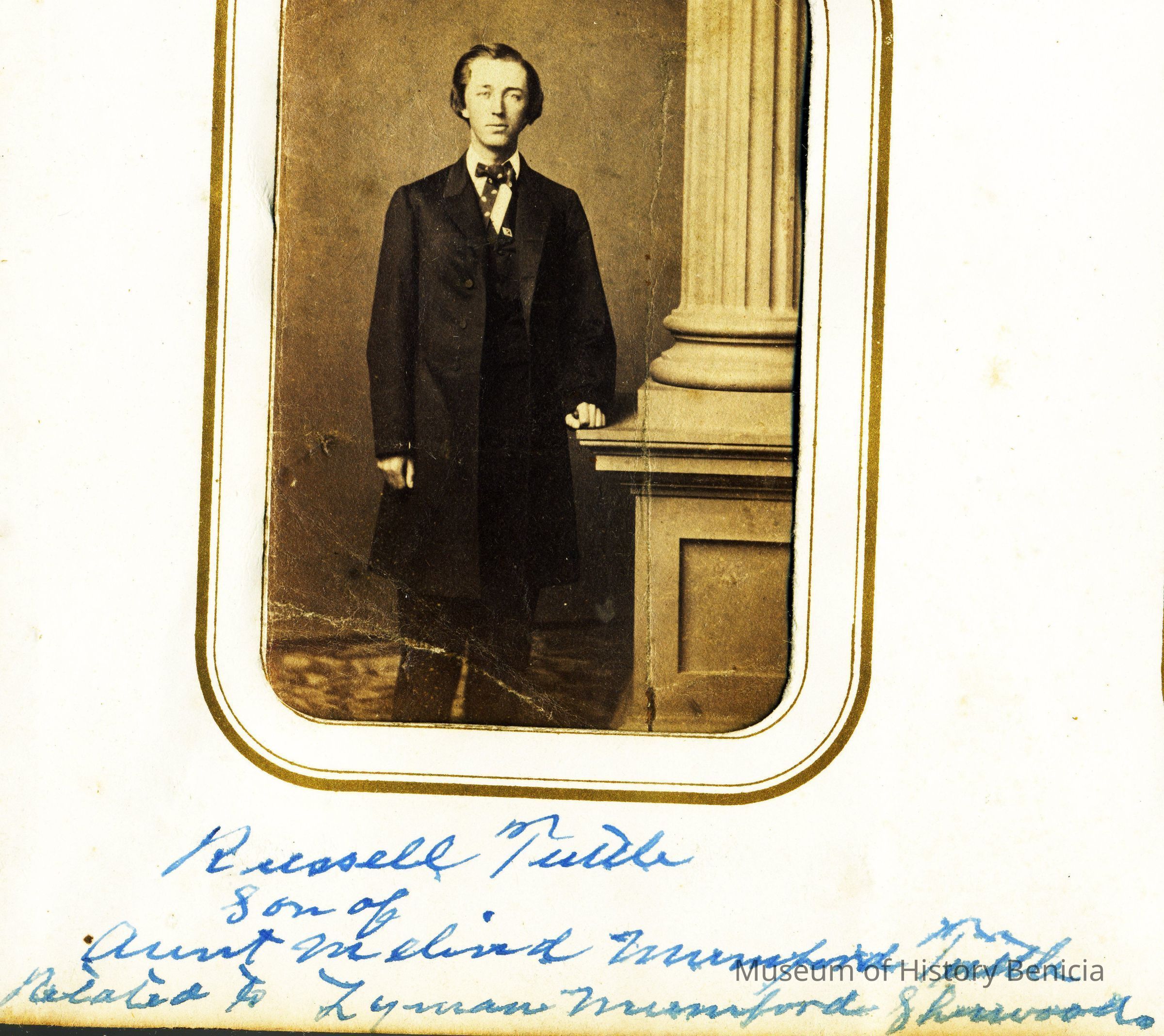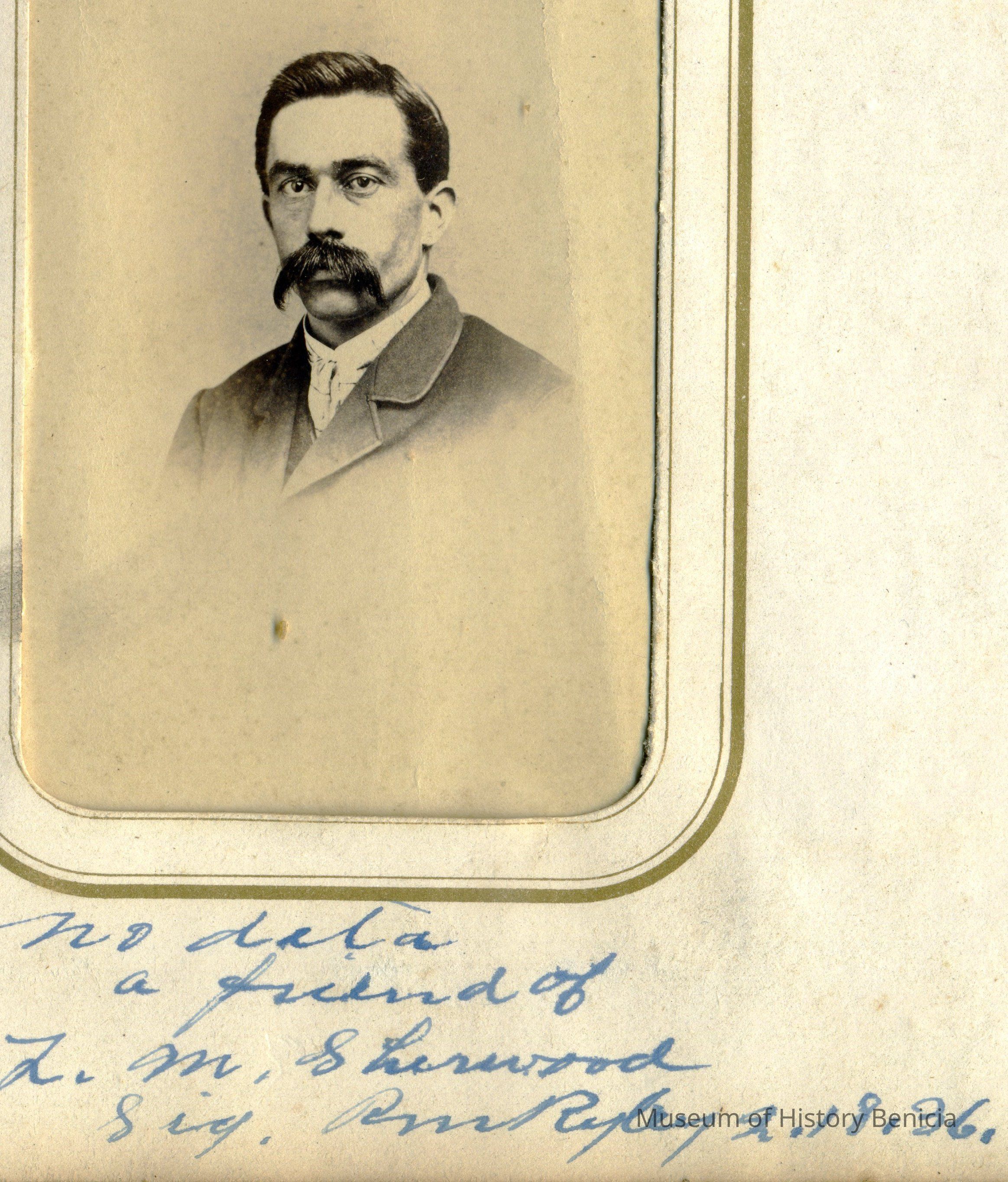 These photos are in the photo album under record number 2017.030.1006. This album belonged to Lyman M. Sherwood. This is Lyman M. Sherwood who was born 02/20/1843 in Le Raysville, PA. He died in Livermore, Alameda Cty, CA on 01/17/1925. He was on the ship Saranac which patrolled along the West Coast around 1860. Many of the photos in the album are of sailors from that ship.