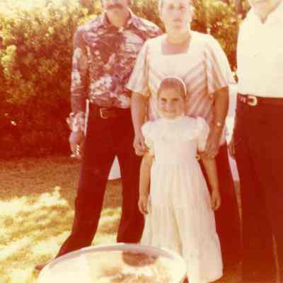 Color Photograph - three adults and one child in a garden. They are probably David and Linda Henderson and their daughter with Ray Rankin.