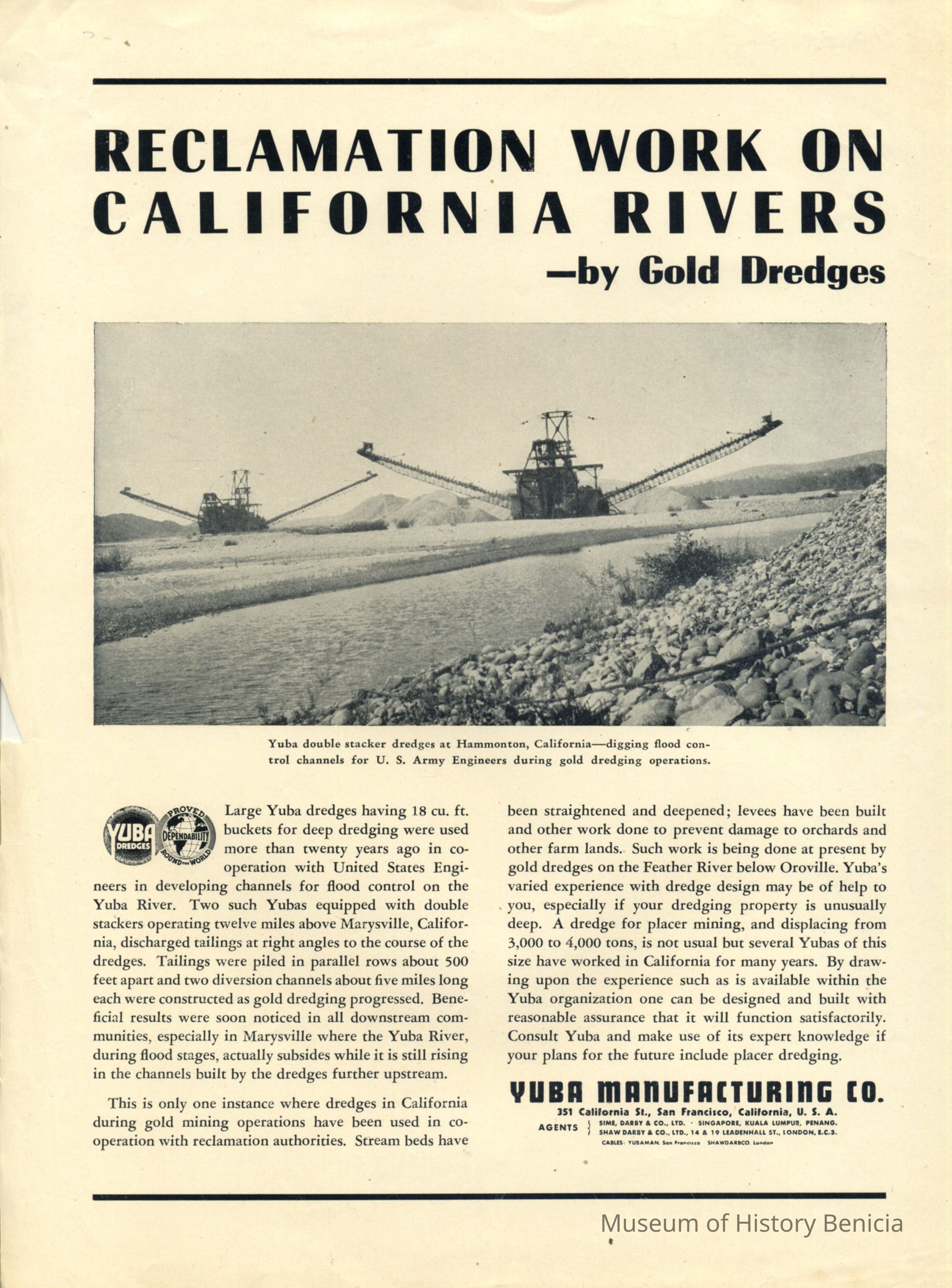 Advertisemnet re Yuba dredges digging flood control channels for U.S. Army Engineers at Hammonton, CA