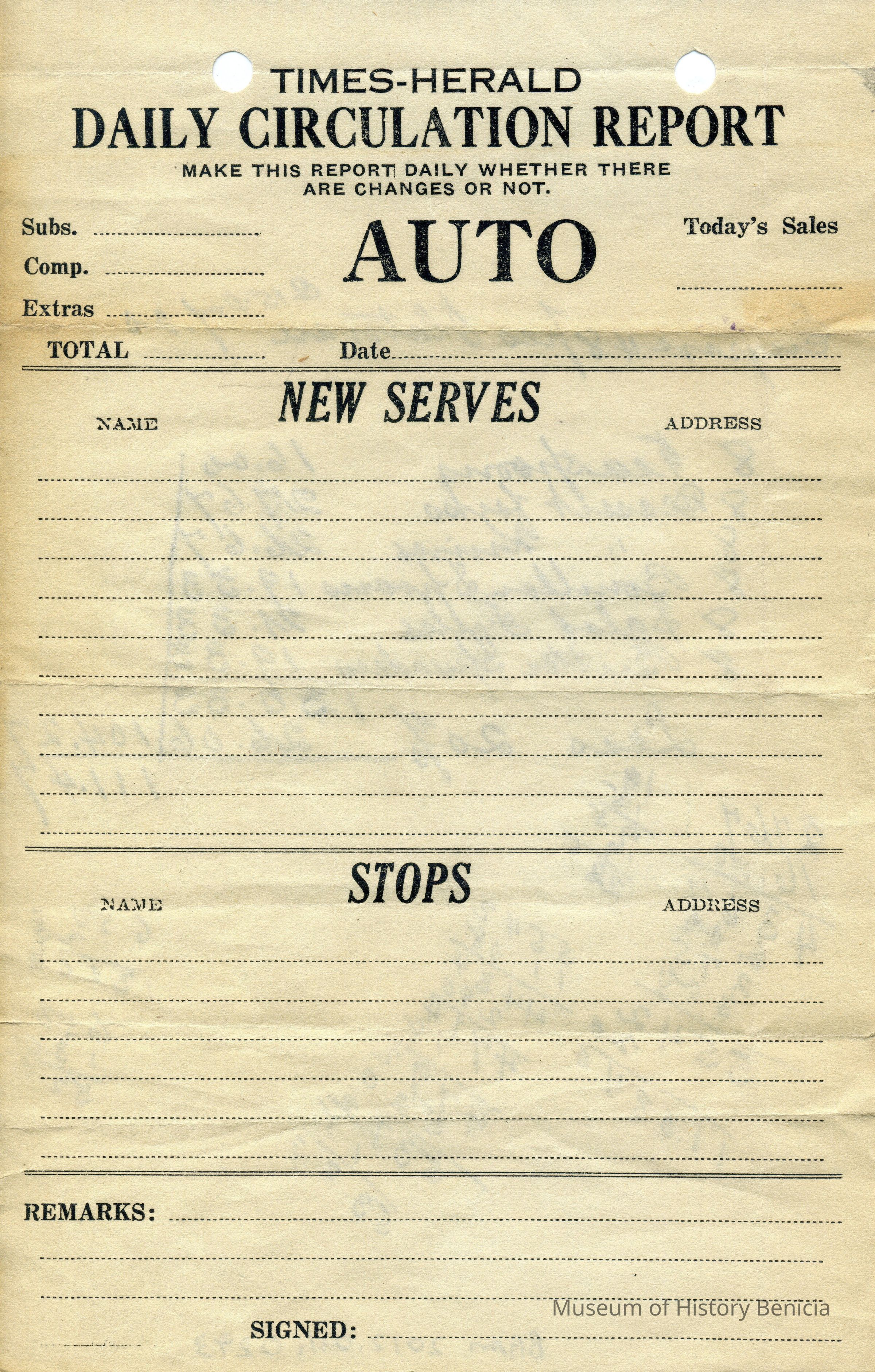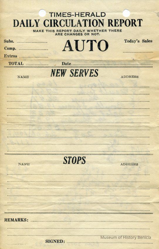 Times-Herald Daily Circulation Report blank. This was used as scratch paper to add up pieces of silverware and their cost.