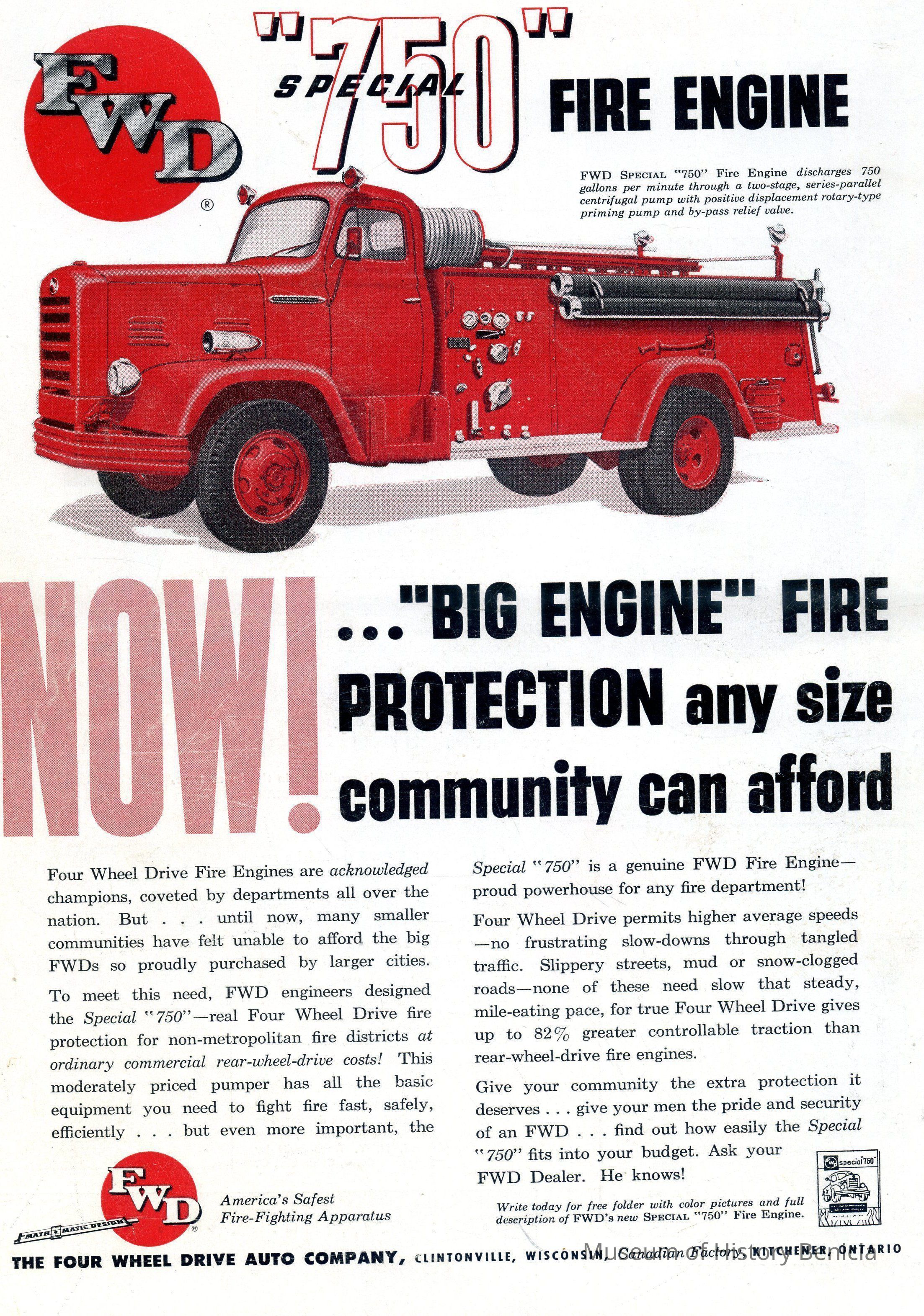 FWD "Special '750' Fire Engine" "Now! 'Big Engine' Fire Protection any size community can afford".