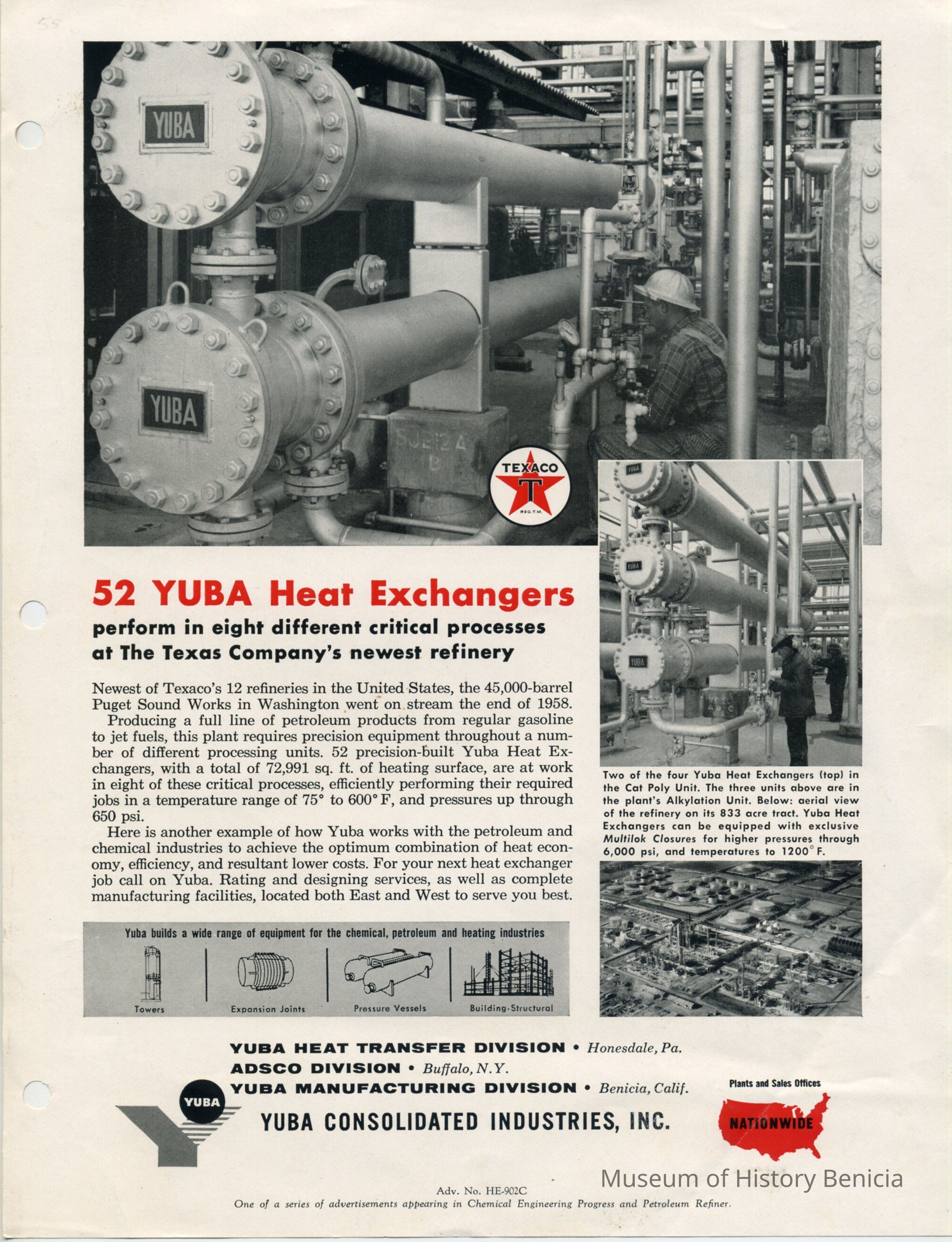 Advertisement in "Chemical Engineering Progreaa and Petroleum Refiner" 1958 Tell about 52 Yuba heat exchangers installed at new Texaco refinery- Puget Sound