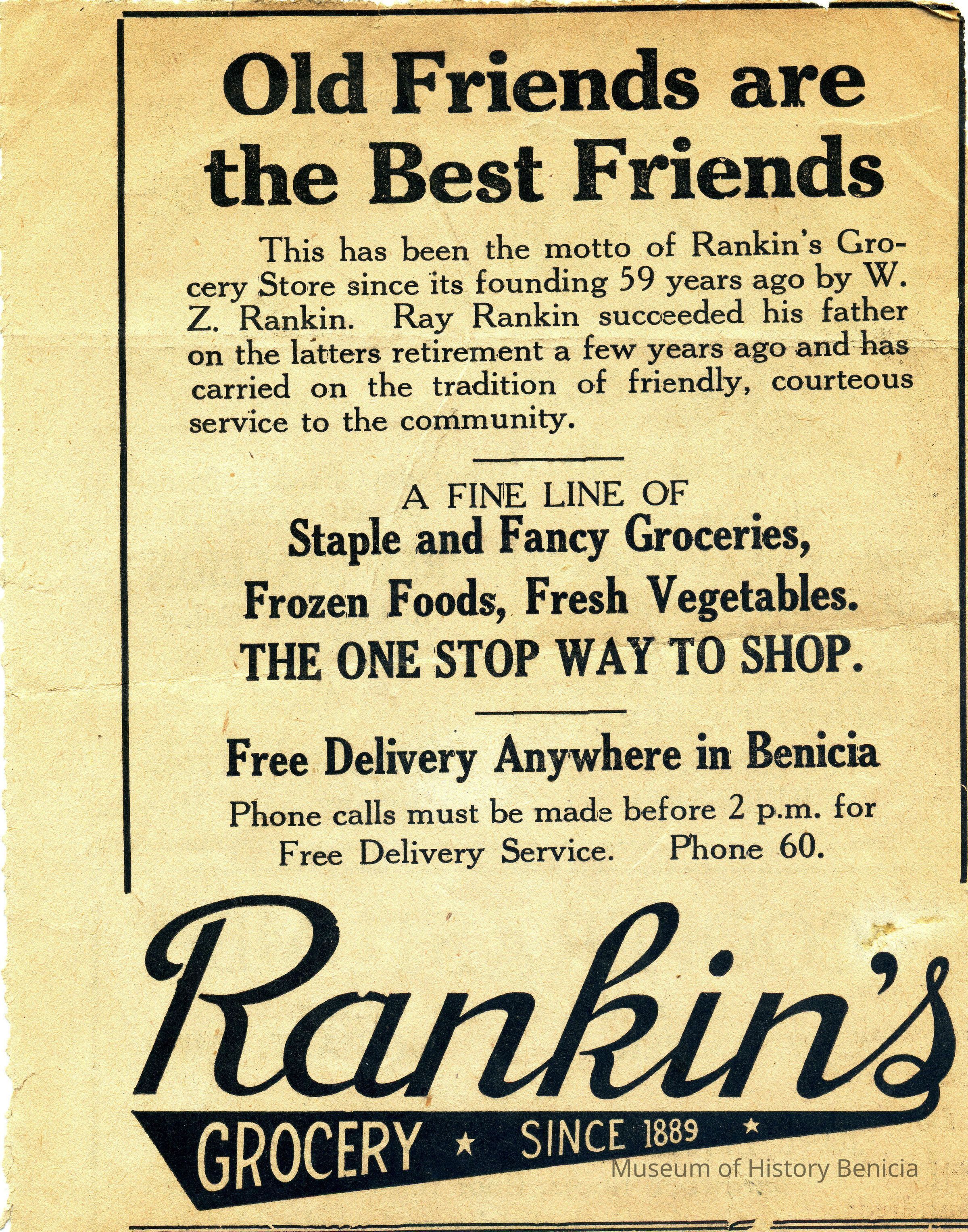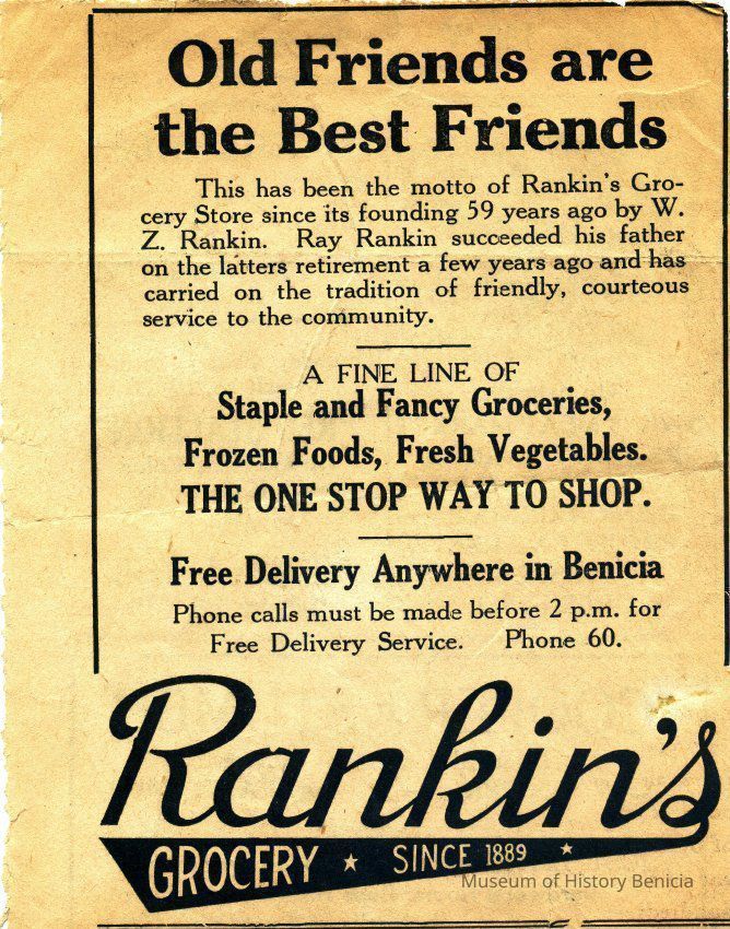This is an ad from the Benicia Herald of an unknown date, for Rankin's Grocery. The ad says the store was established in 1889. It offers "a fine line of staple and fancy groceries".Collection