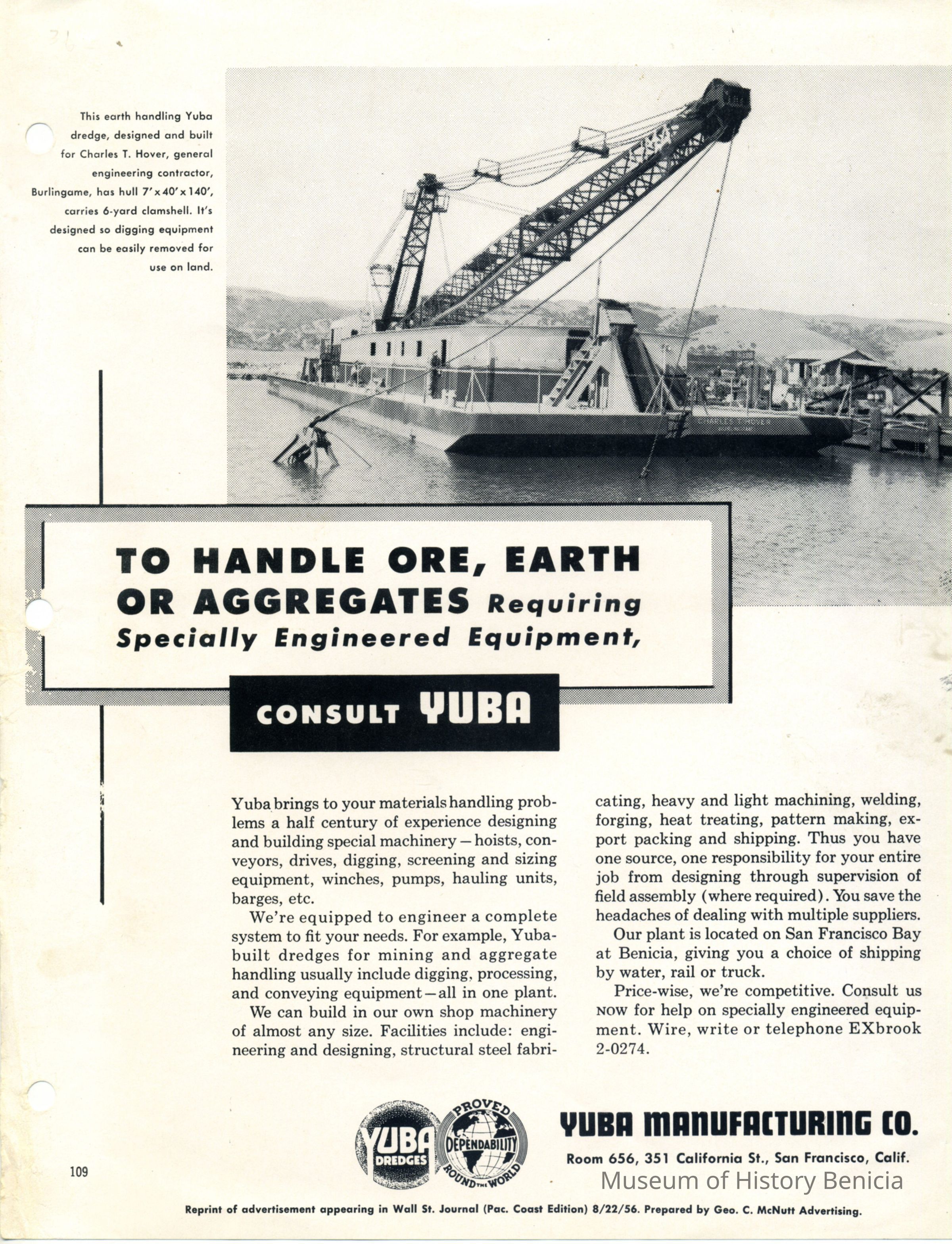 Reprint of Advertisement appearing in the "Wall Street Journal" Aug 22, 1956 shows Yuba clam shell dredge built for Charles T Hover, General Engineering Contractor.Collection