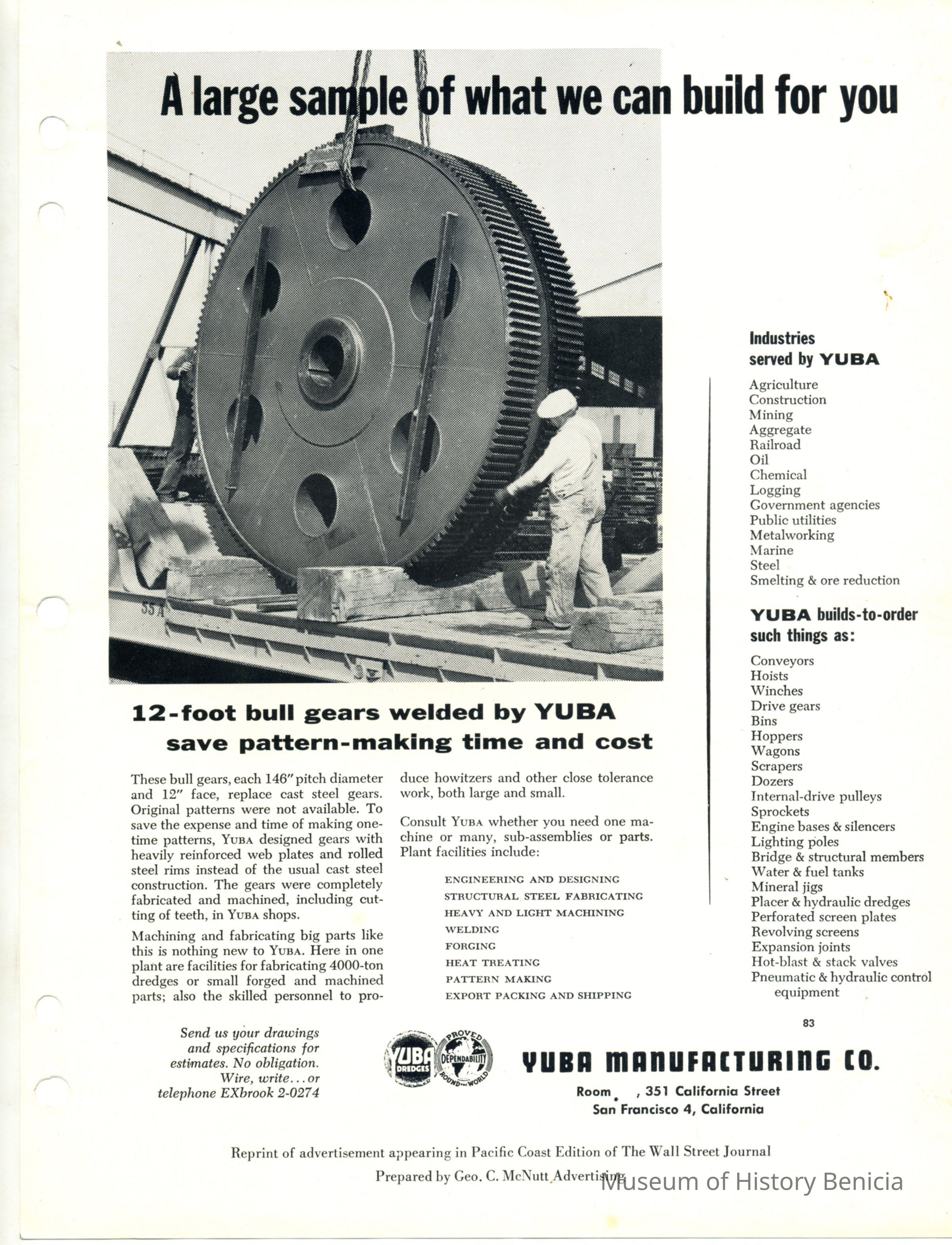 Advertisement appearing in "Wall Street Journal" Feature re 12 ft Bul gears for dredges made with welds instead of east steel welds.