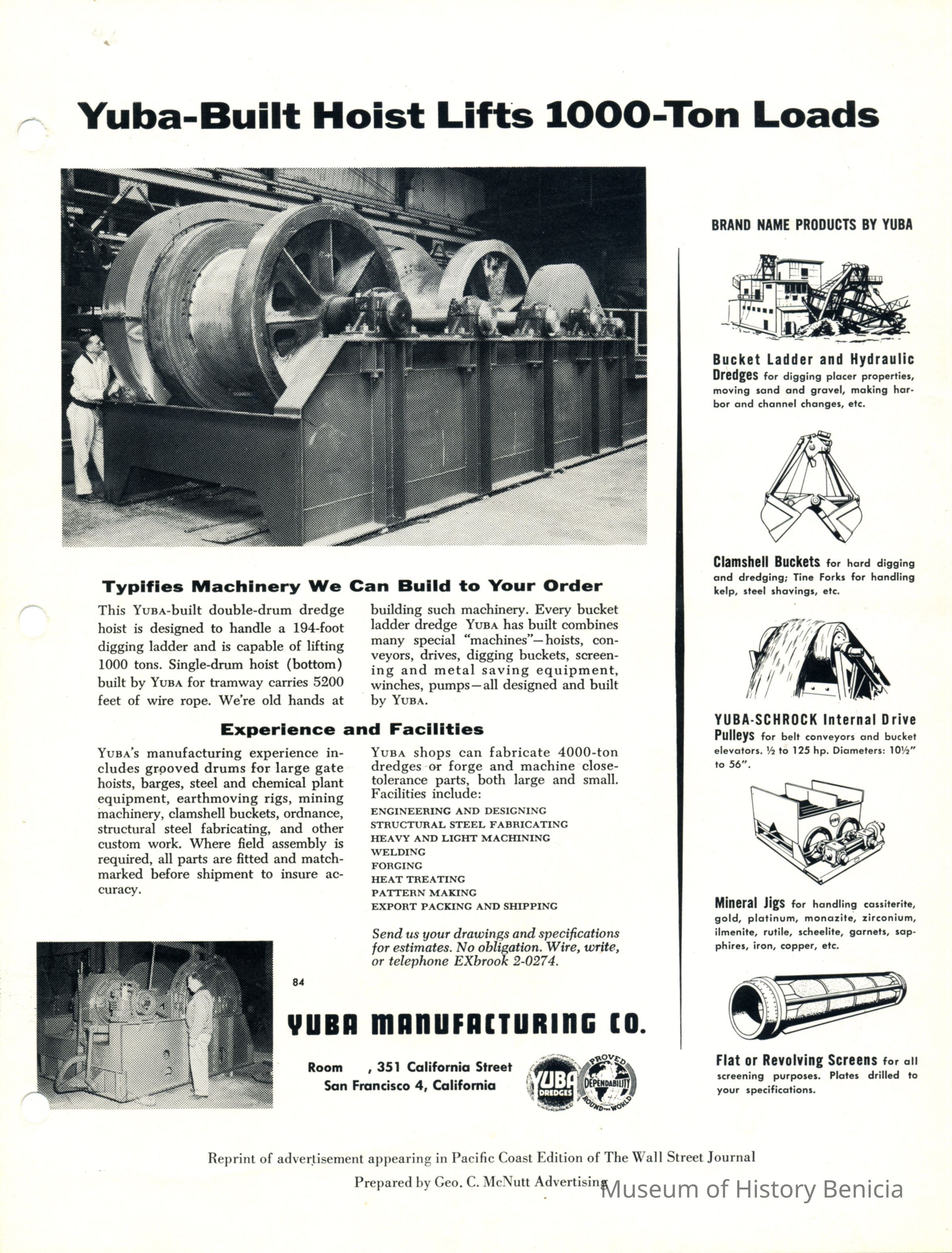 Reprint of Advertisement appearing in "Wall Street Journal" re 1,000 ton hoist for dredges and also other products