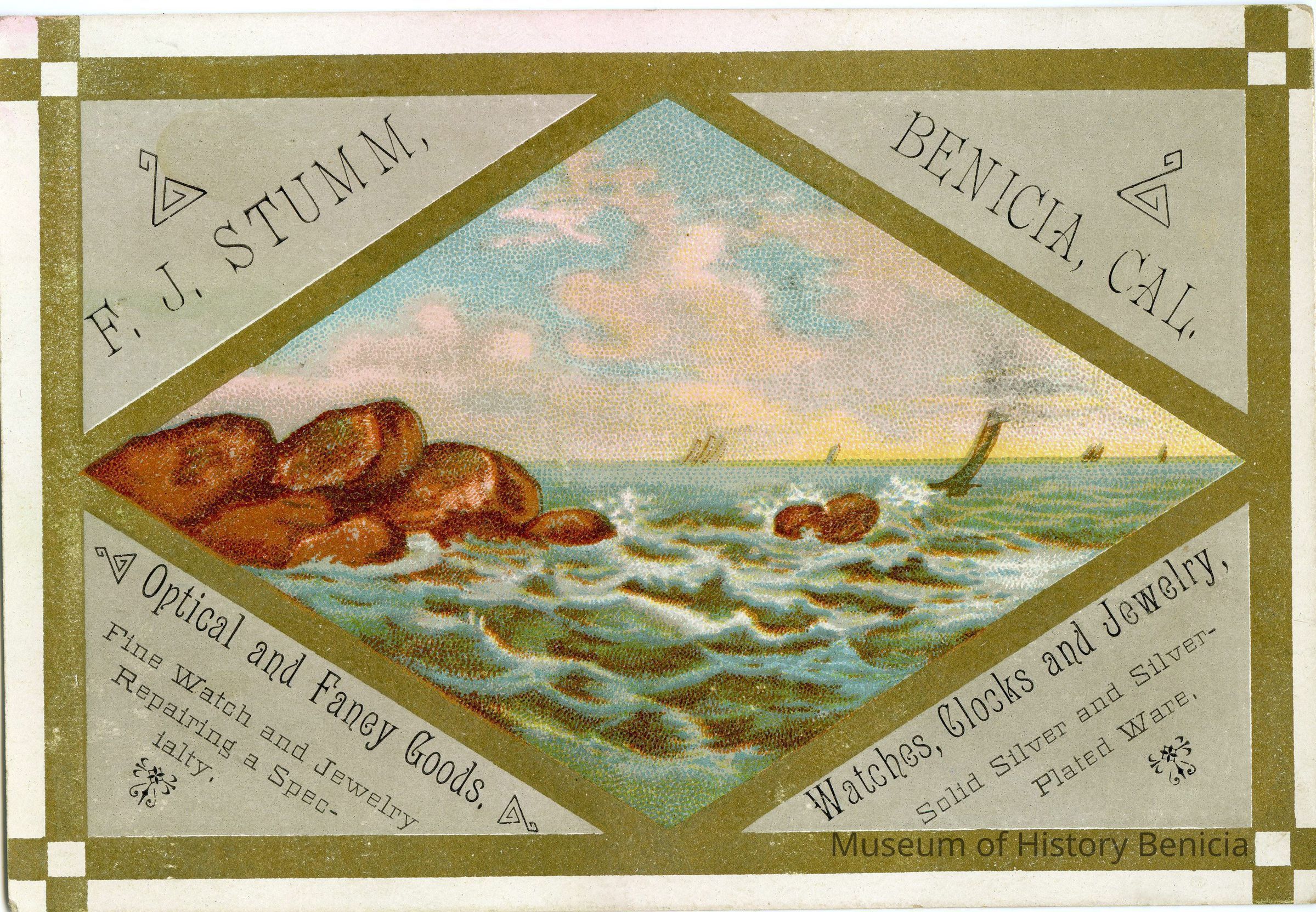 This is a small card advertizing the F.J. Stumm Jewelry store in Benicia. One side is blank. The other side has a color drawing of an ocean scene in a diamond with information about goods that the store sells or provides along the outside.Collection