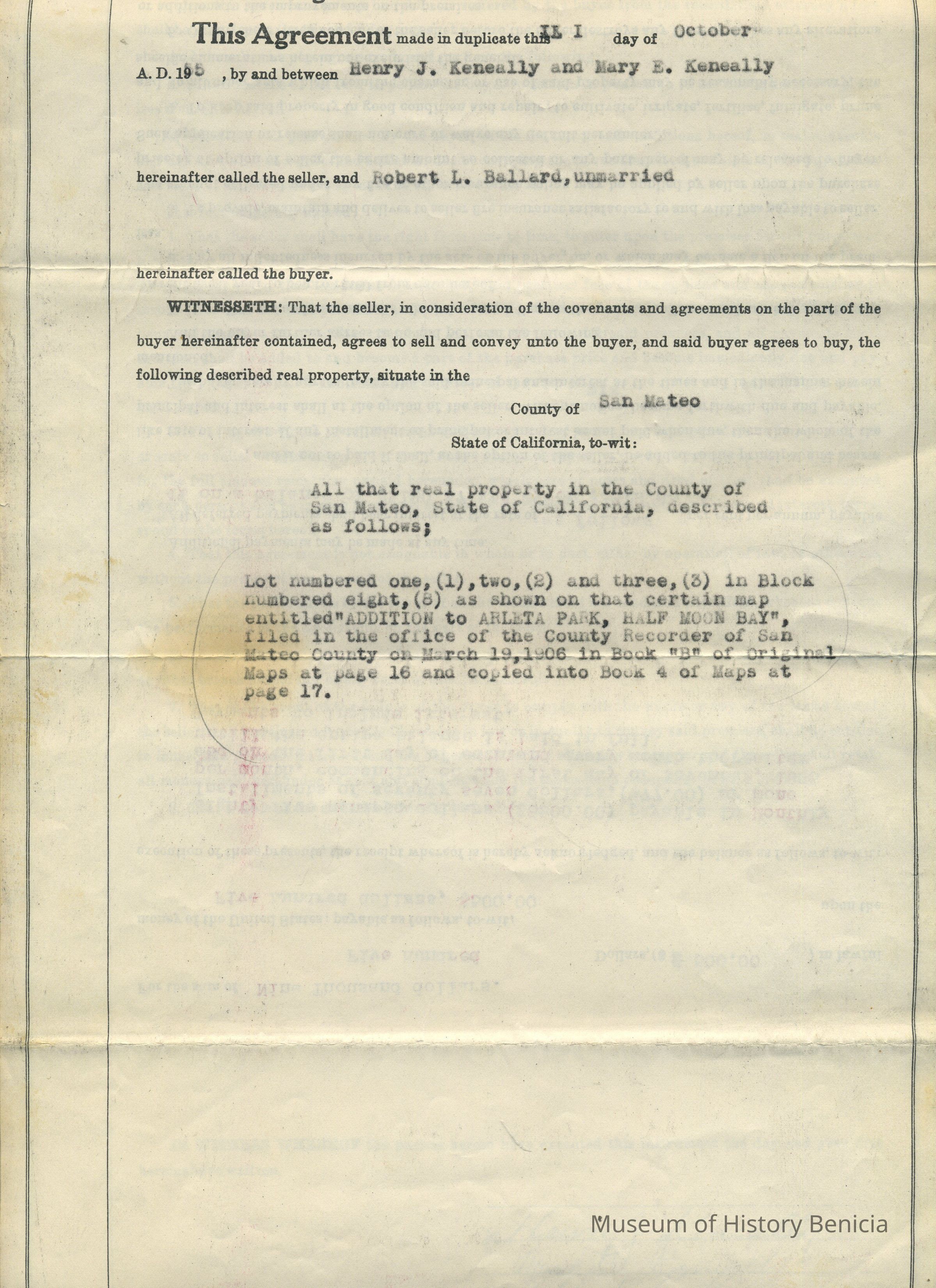 Legal Document - Agreement for Sale of Real Estate - Duplicate Carbon Copy between Henry J. Keneally and Mary Keneally and Robert Ballard, dated October 1, 1955. Western Title Insurance & Guaranty Co. handled the transaction;