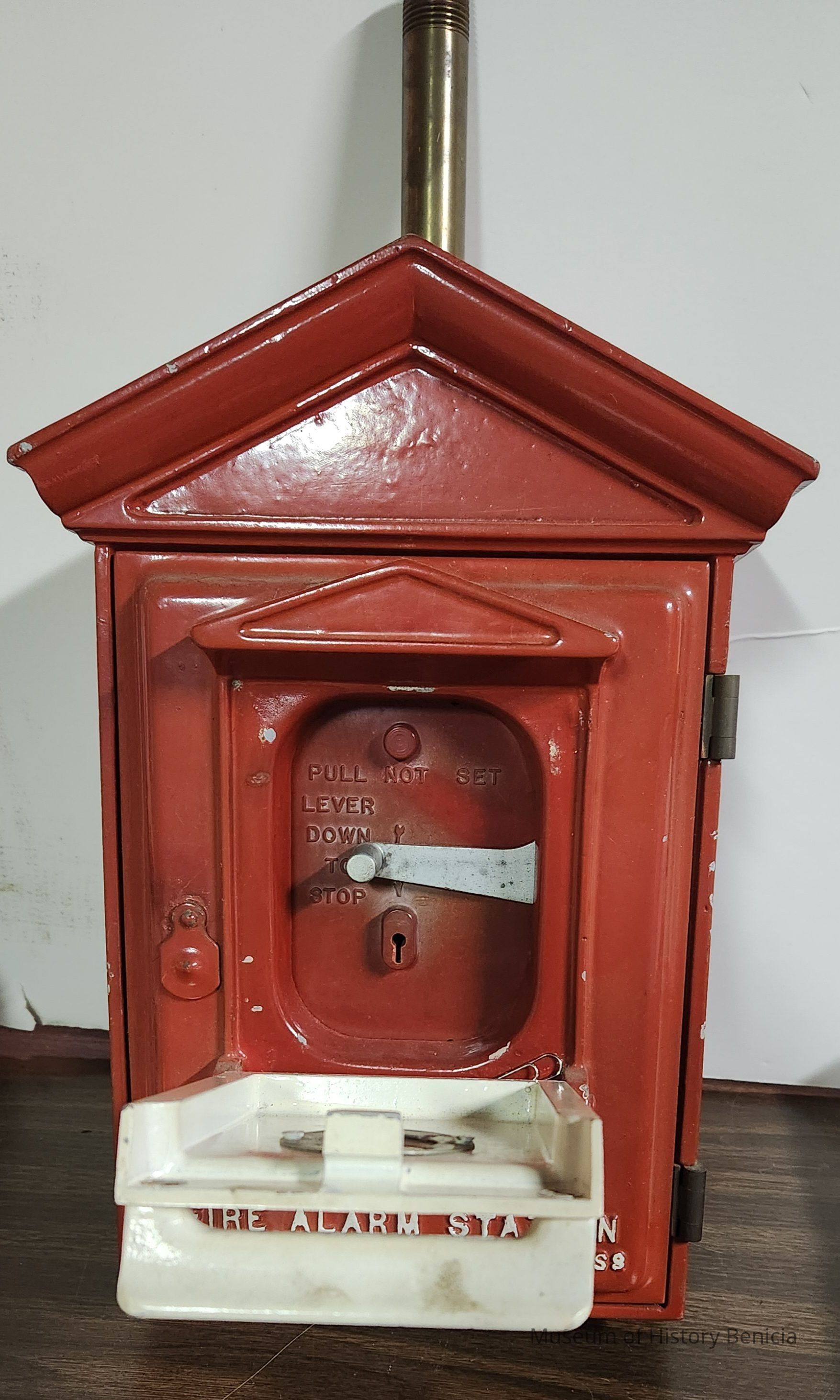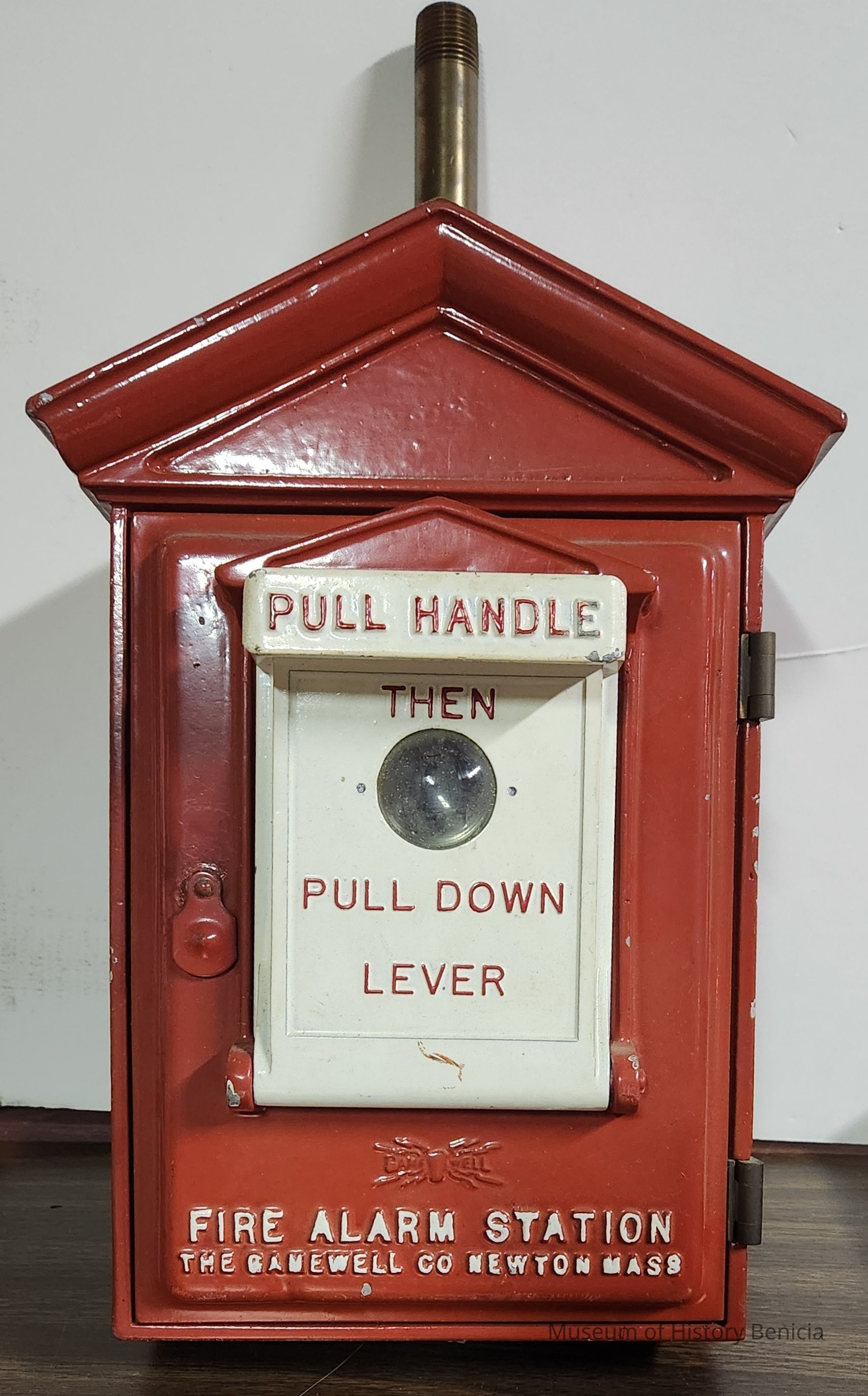 Gamewell Auxiliary fire alarm box for municipal or plat fire alarm box connected to alarm system at central receiving station. On front: "Fire Alarm Station / The Gamewell Co. / Newton Mass". Inside: "Pull lever down to stop". In white on the handle: "Pull handle"; on white plate "Then Pull Down Lever". There is a keyhole to get to the inside of the box under a sliding cover.Collection