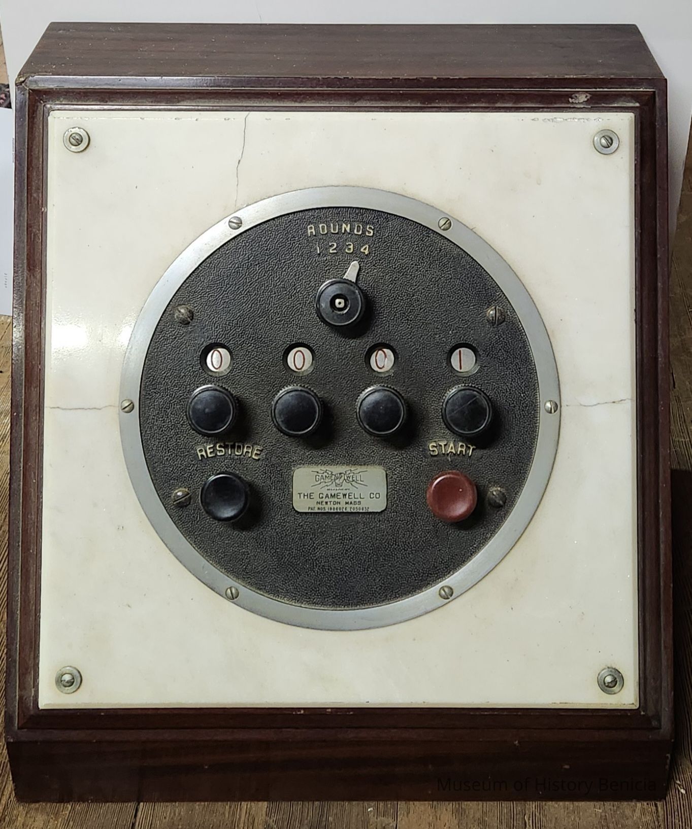 Central station fire alarm control panel used in fire alarm headquarters to "set up", transmit, and activate compressed air pneumatic diaphone for public notification of fire incident. It is from the Benicia ArsenalCollection
