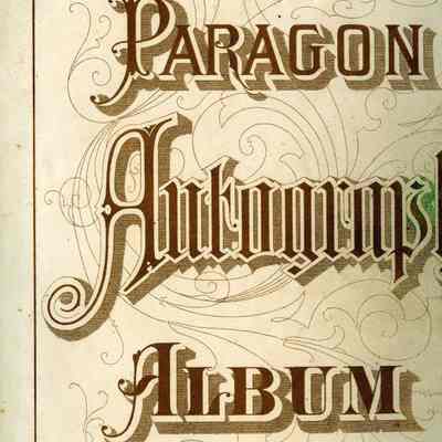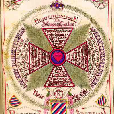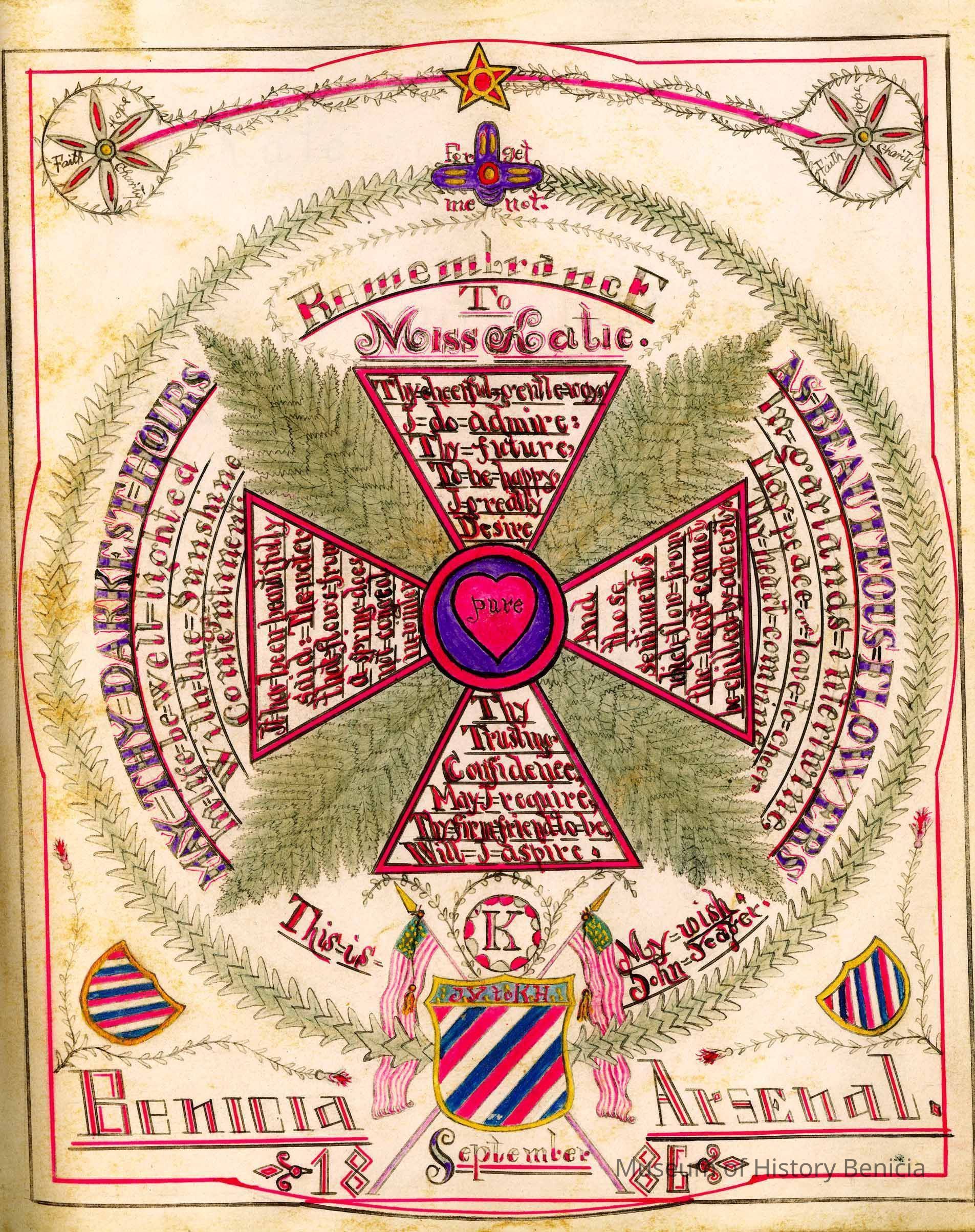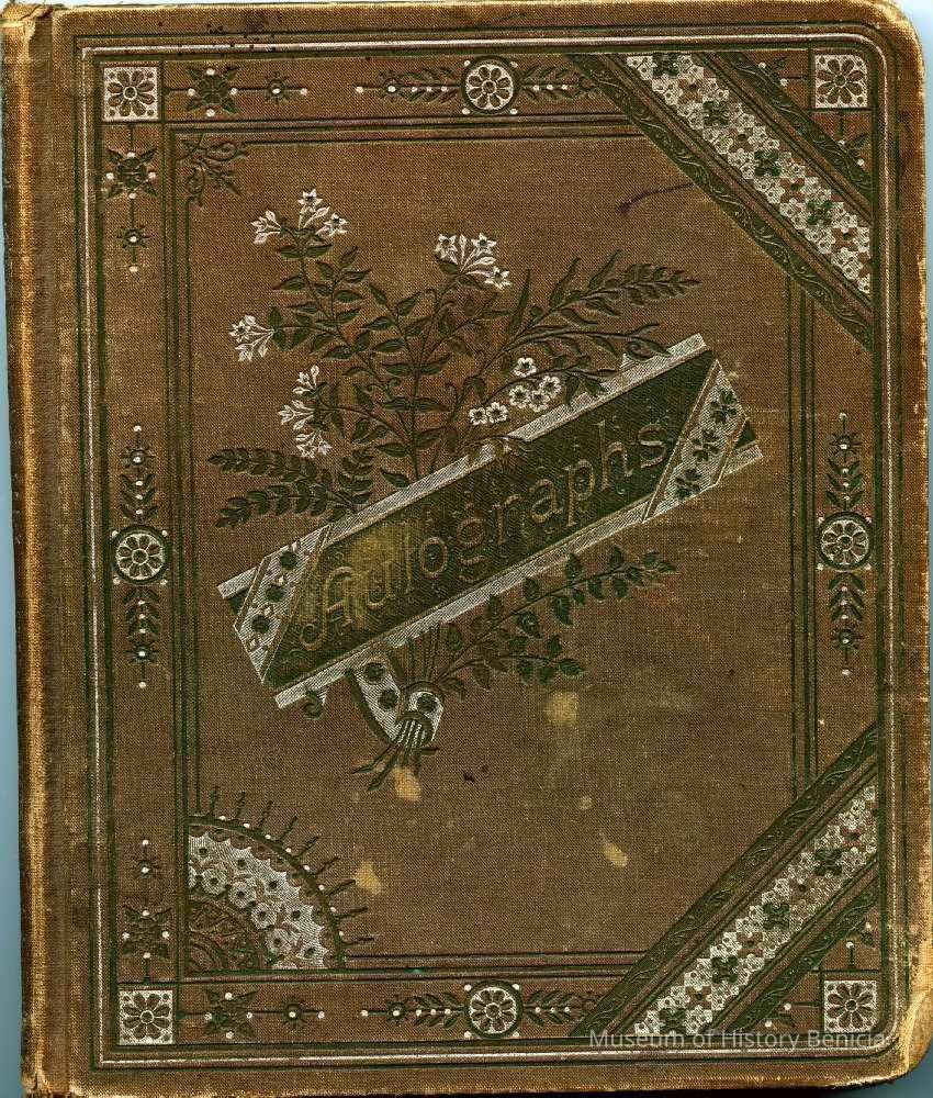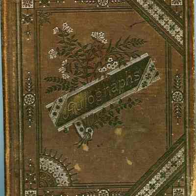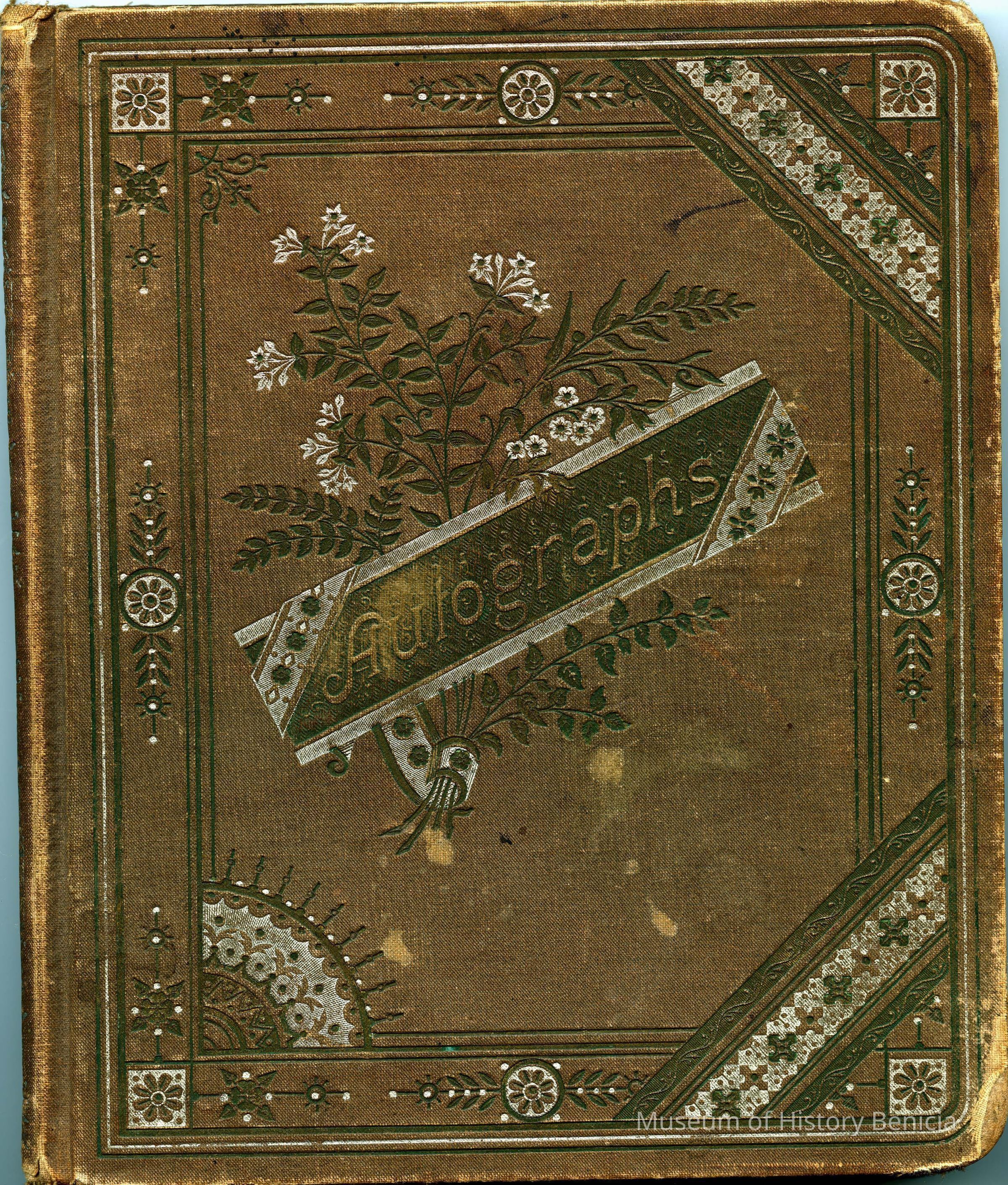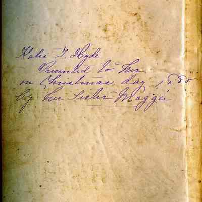 Autograph book, a "Paragon Autograph Album", with inscription reading "Katie G. Hyde, Presented to her on Christmas day 1880 by her sister Maggie". Filled with messages from friends, stickers of flowers, and a few hand-drawn pictures from those leaving their messages.