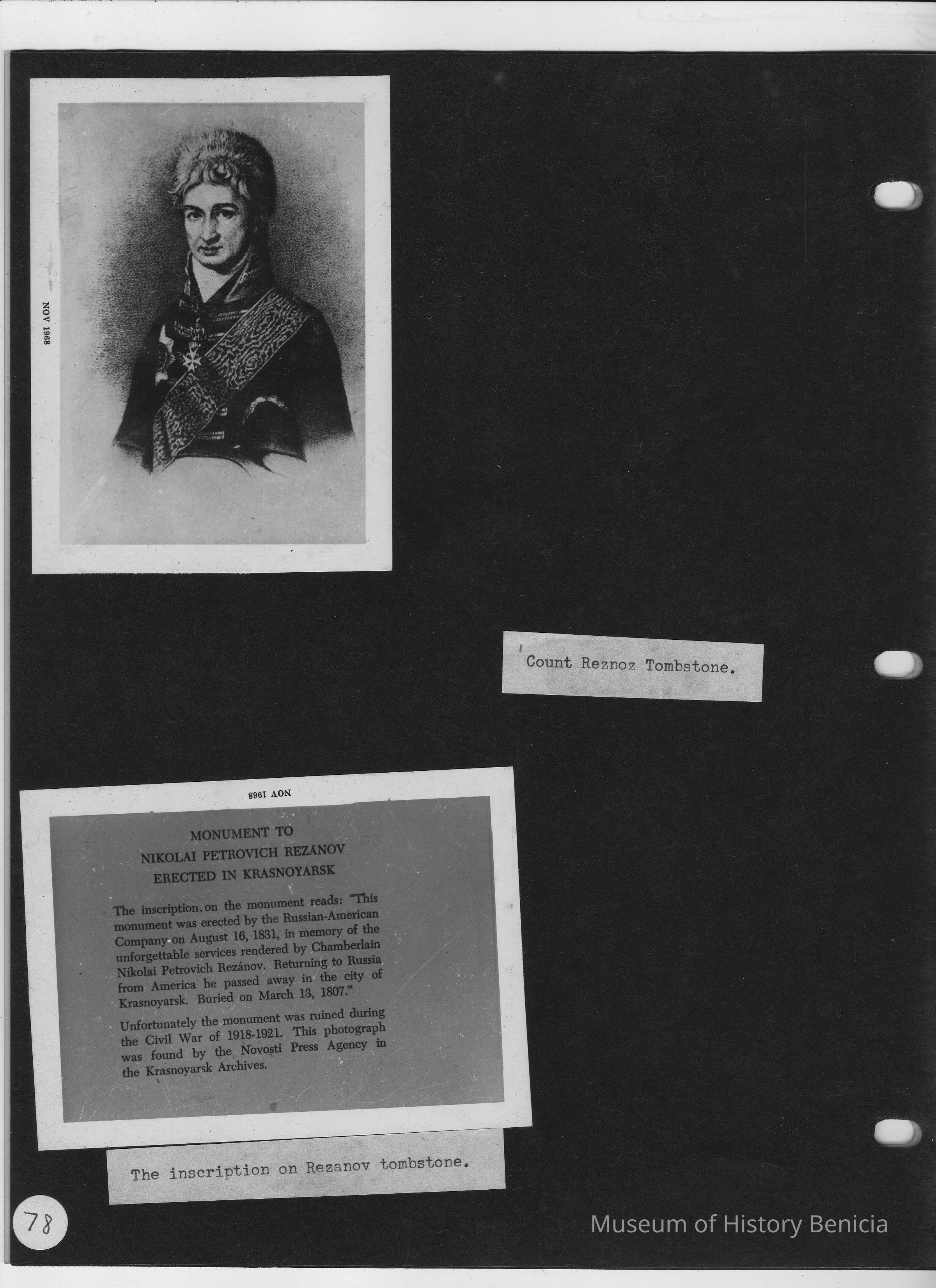 Page contains three B/W photos. Top left shows a picture of Nikolai Rezanov; top right shows Rezanov's tombstone in Russia. Photo at bottom left is meant to be the caption to the picture of the tombstone.Collection