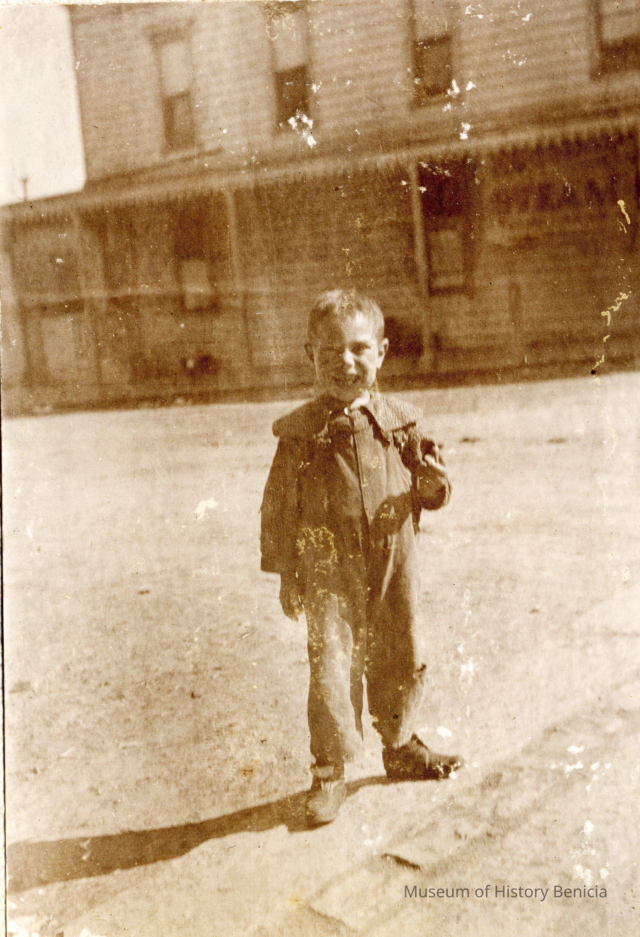 This is a scan of one of the photos on those pages in that album. It shows a boy on a downtown street.Collection