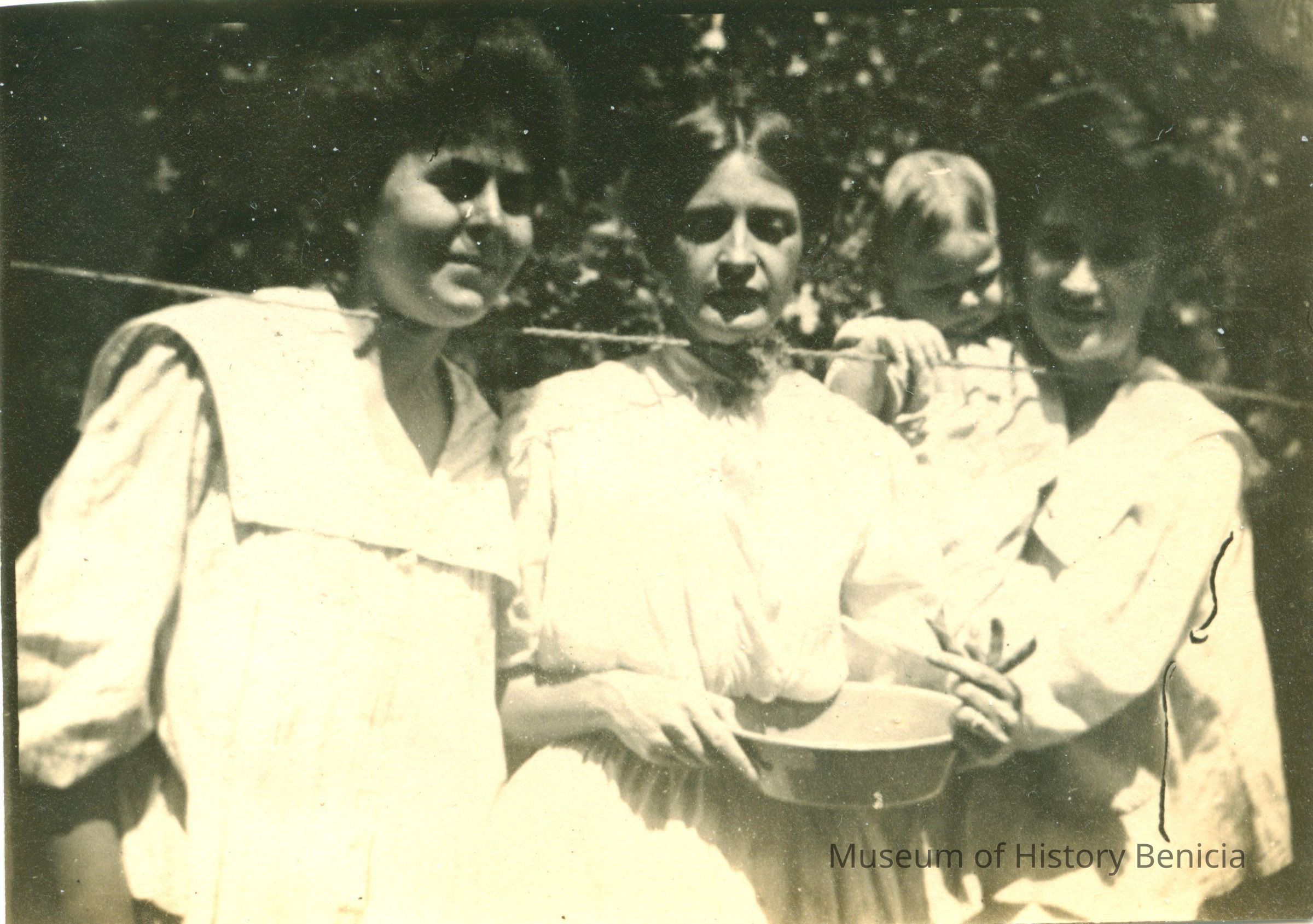 Three women and a baby . Back says: "Taken in backyard over the clothes line."