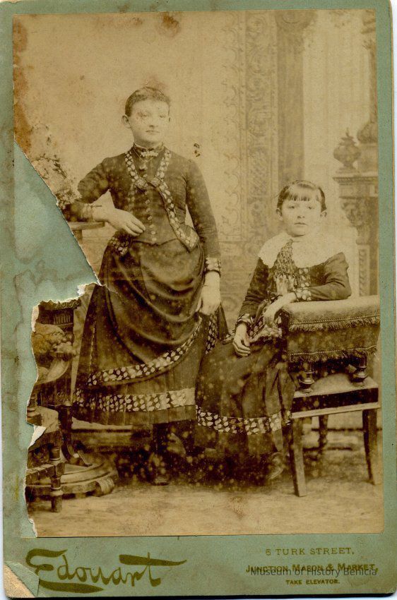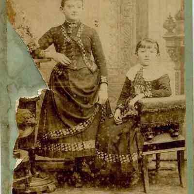 Cabinet photo of two young girls. It is in a studio. The photo is ripped on the left side and shows some water damage. The image is starting to fade. It came from a photo album of portraits with some photos with names of subjects. Family names: Durrant, Pfister, Dalton, Reynolds, Booth, Gucker. Album is covered in red plush. This photo is not named.Collection