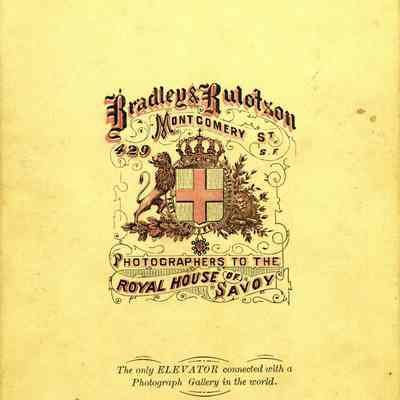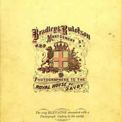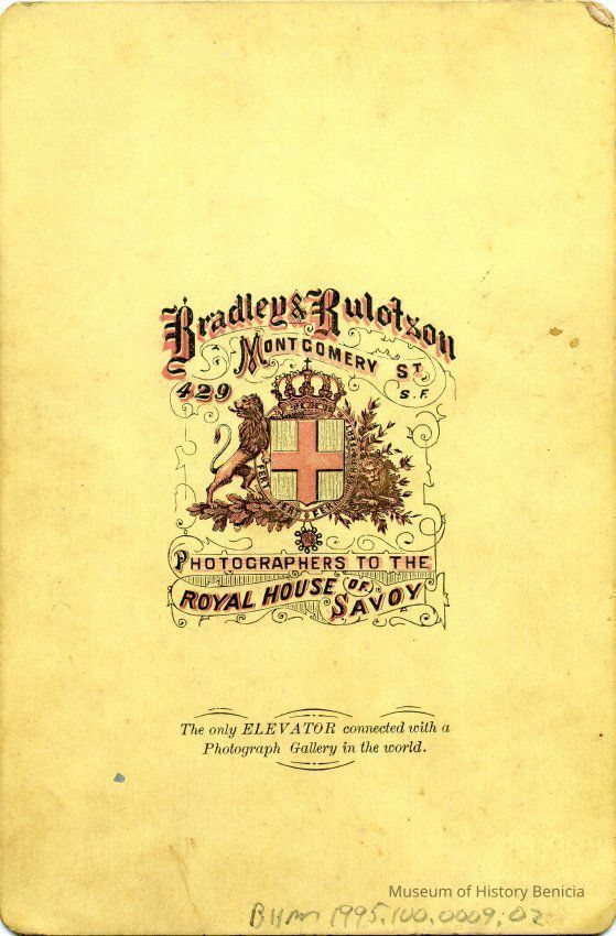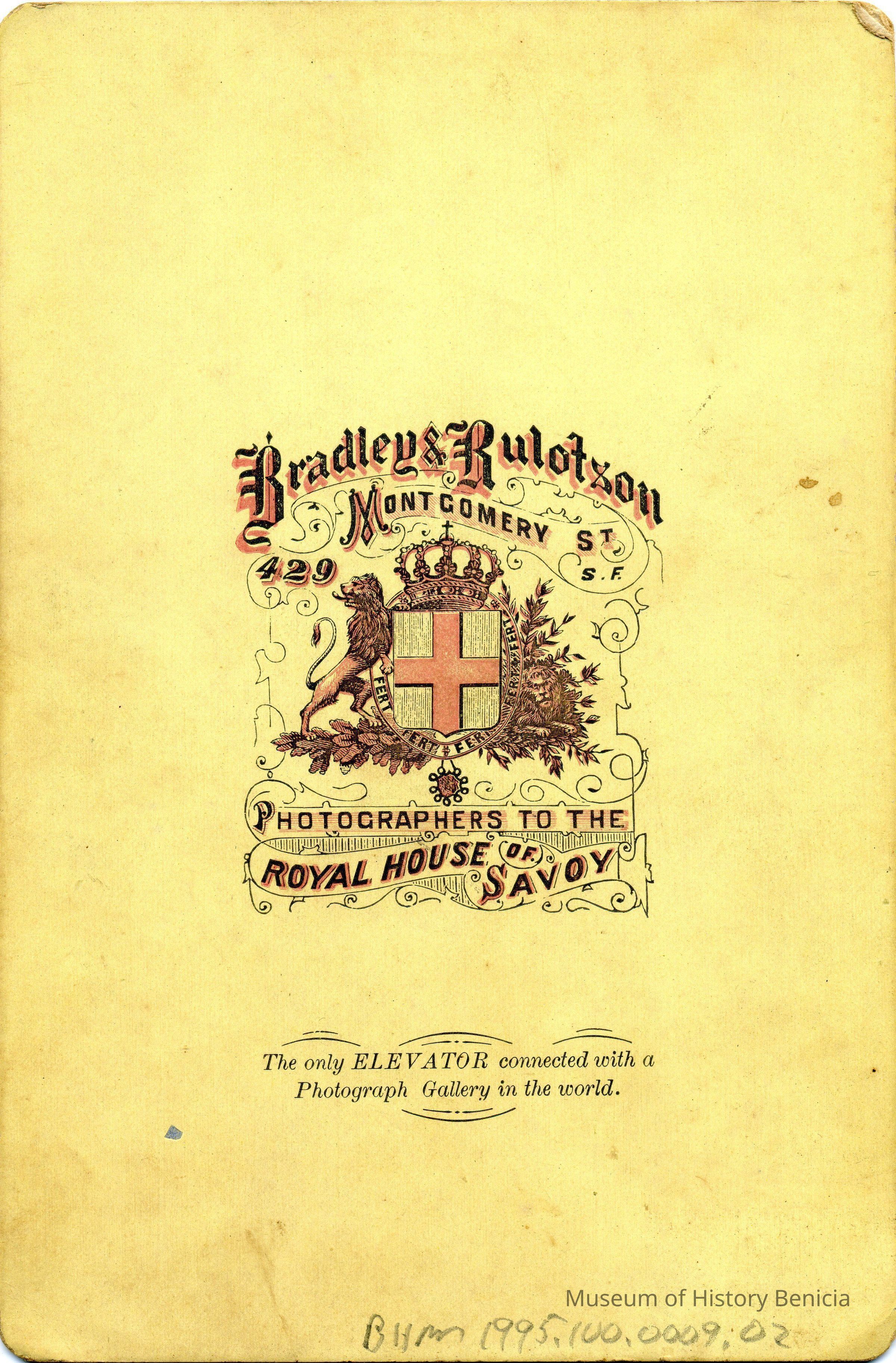 The photo is by the studio of Bradley & Rulofson. They made the claim that they were the only studio with an elevator in 1870. The Photography Art Association of the Pacific censured them because they said the claim was not true. The studio removed the claim from their advertising after this. This may mean that the photo was taken closer to 1870 than 1890s.Collection