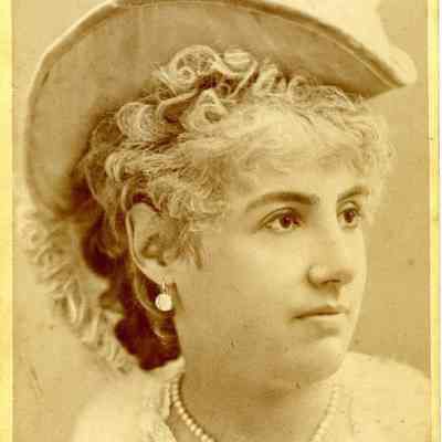Cabinet photo of a young woman with a stylish hat. It is in a studio. The image shows some foxing. It came from a photo album of portraits with some photos with names of subjects. Family names: Durrant, Pfister, Dalton, Reynolds, Booth, Gucker. Album is covered in red plush. This photo is not named.