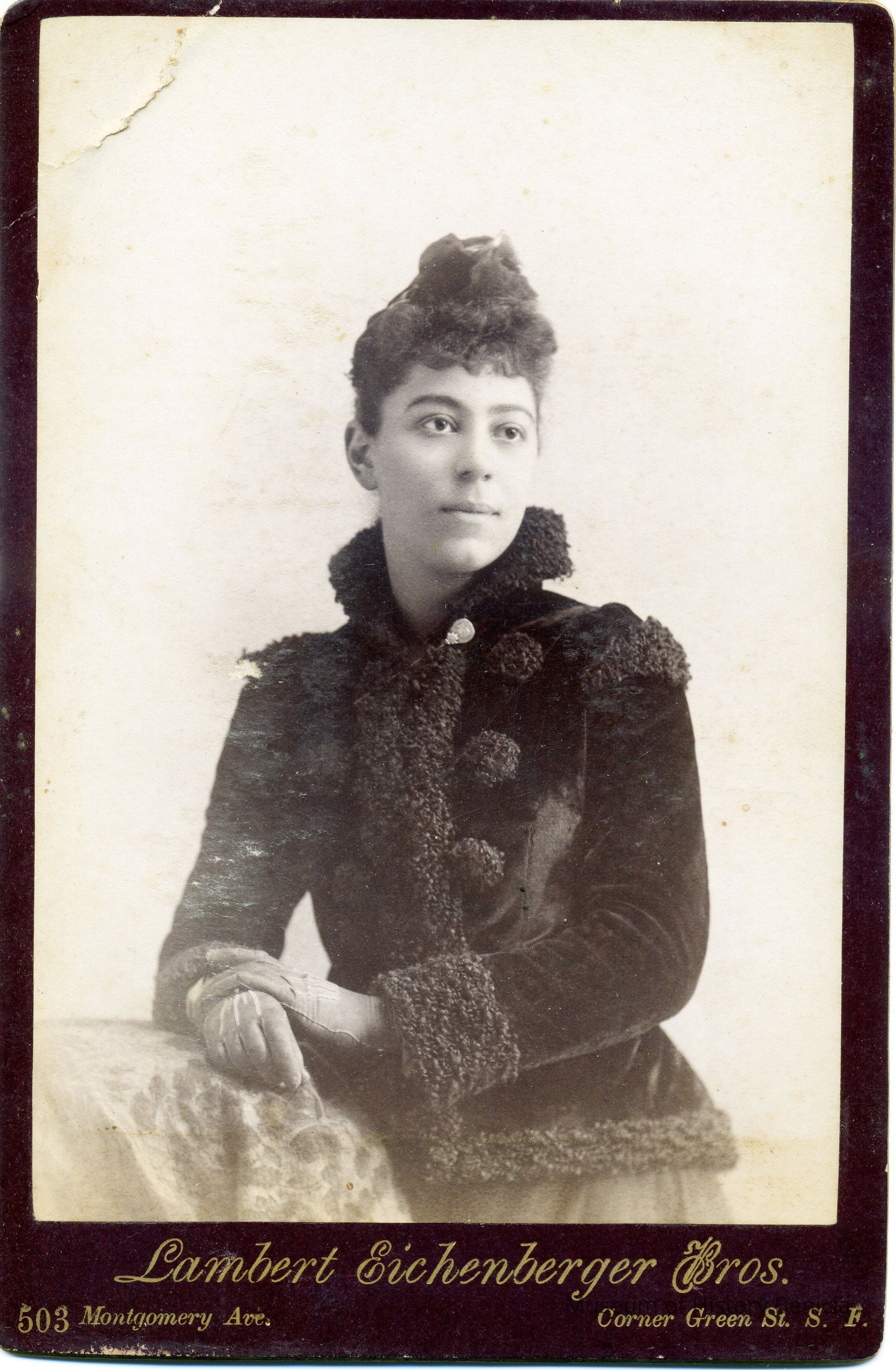 Cabinet photo of a young woman. It is in a studio. The image shows some foxing. It came from a photo album of portraits with some photos with names of subjects. Family names: Durrant, Pfister, Dalton, Reynolds, Booth, Gucker. Album is covered in red plush. This photo shows the name Esther Myers written under the photo in the album.Collection
