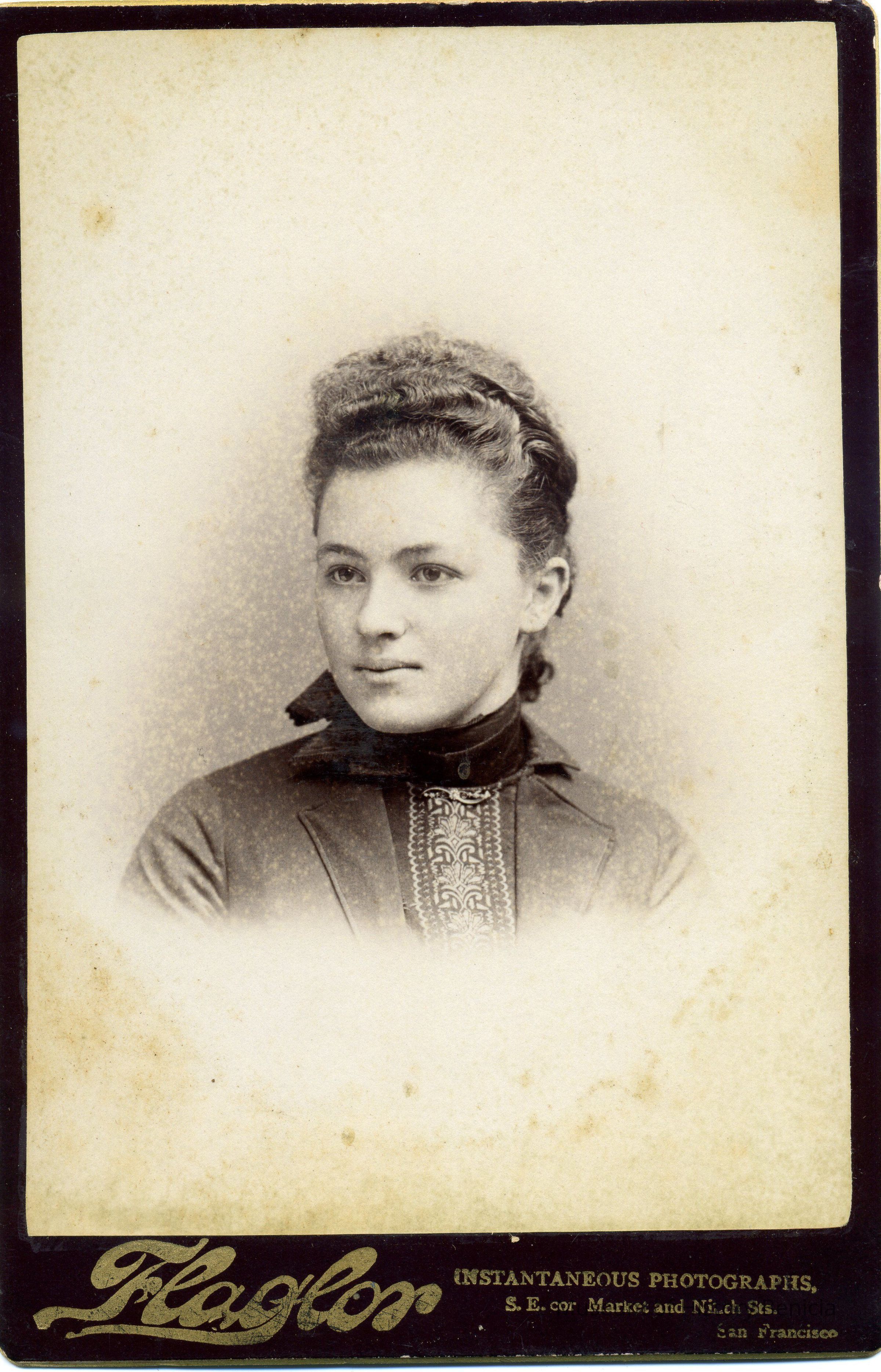Cabinet photo of a woman. It is in a studio. The image shows some foxing. It came from a photo album of portraits with some photos with names of subjects. Family names: Durrant, Pfister, Dalton, Reynolds, Booth, Gucker. Album is covered in red plush. This photo shows no name but it looks like it did say Carrie Pfister before the name was erased. On the back of the photo it says Aunt Emmas(?).
