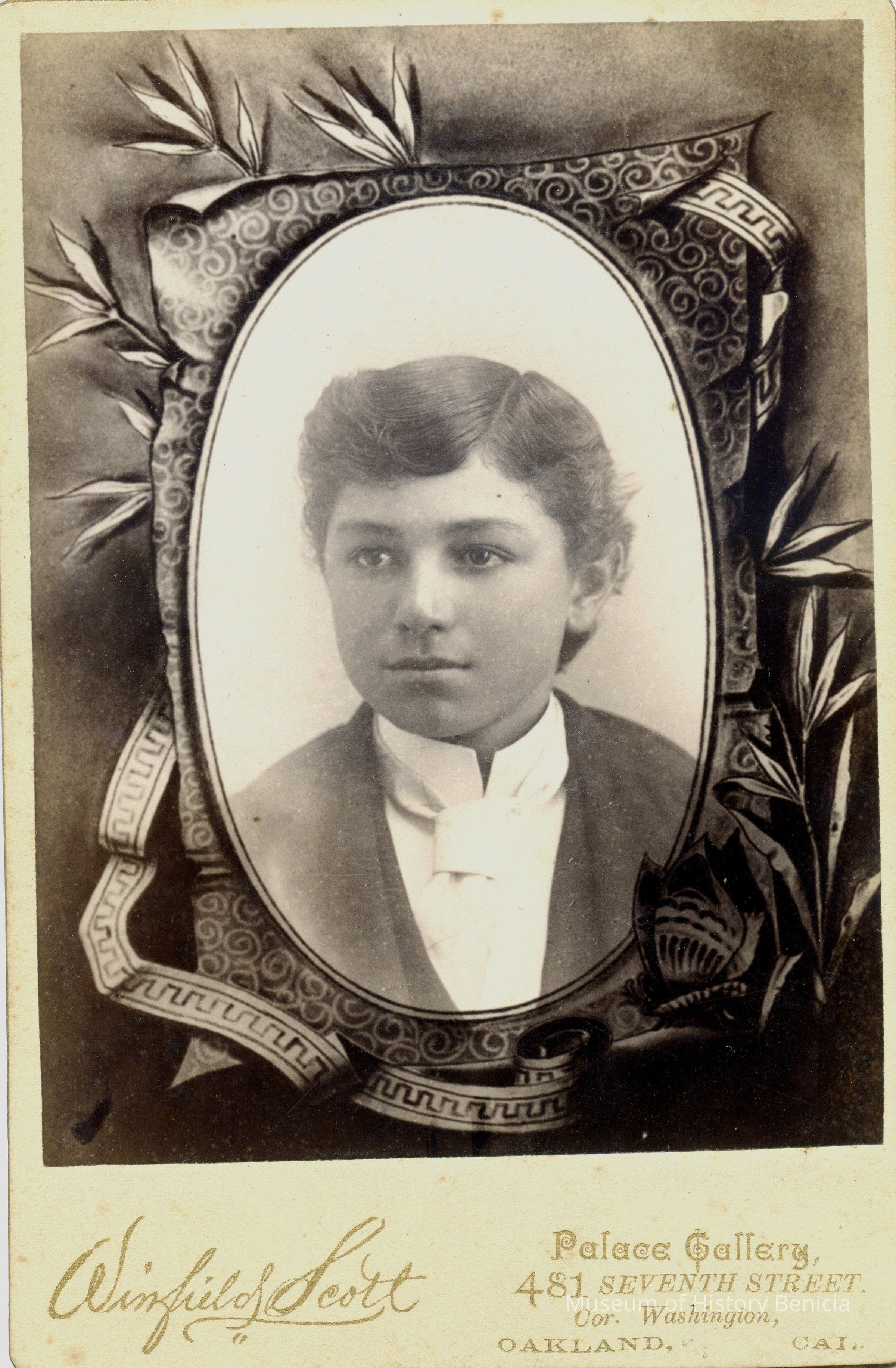 Cabinet photo of a young man with a scroll around the photo. It is in a studio. The image shows some foxing. It came from a photo album of portraits with some photos with names of subjects. Family names: Durrant, Pfister, Dalton, Reynolds, Booth, Gucker. Album is covered in red plush. This photo has the name Frank Pfister written below it in the album. The back of the photo has "Aunt Emma" written on it.