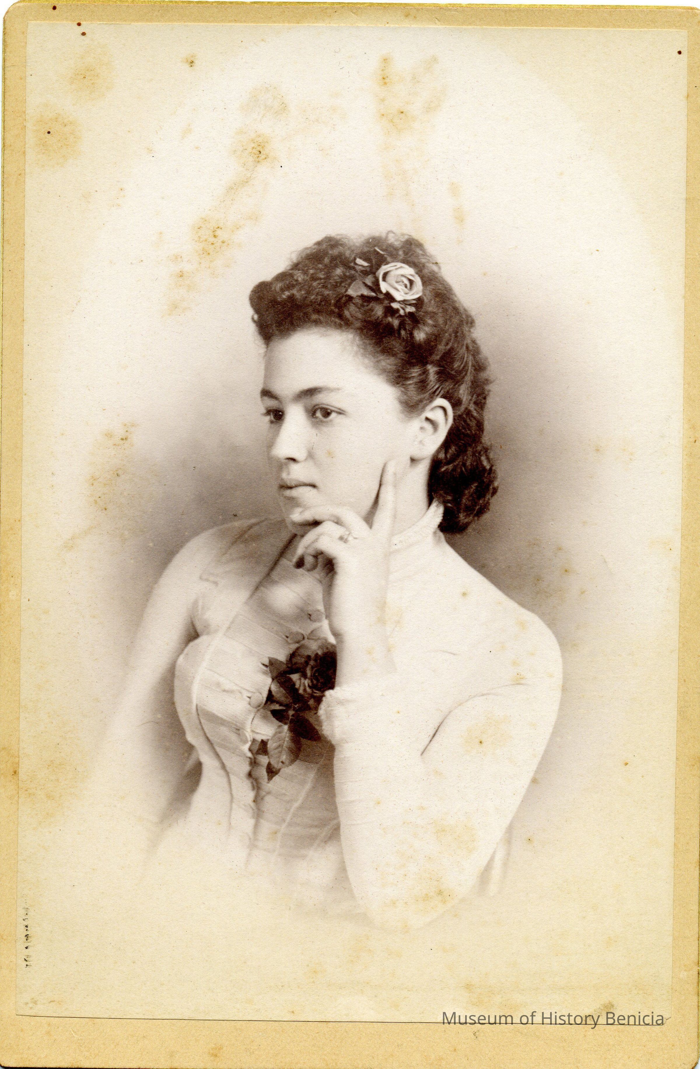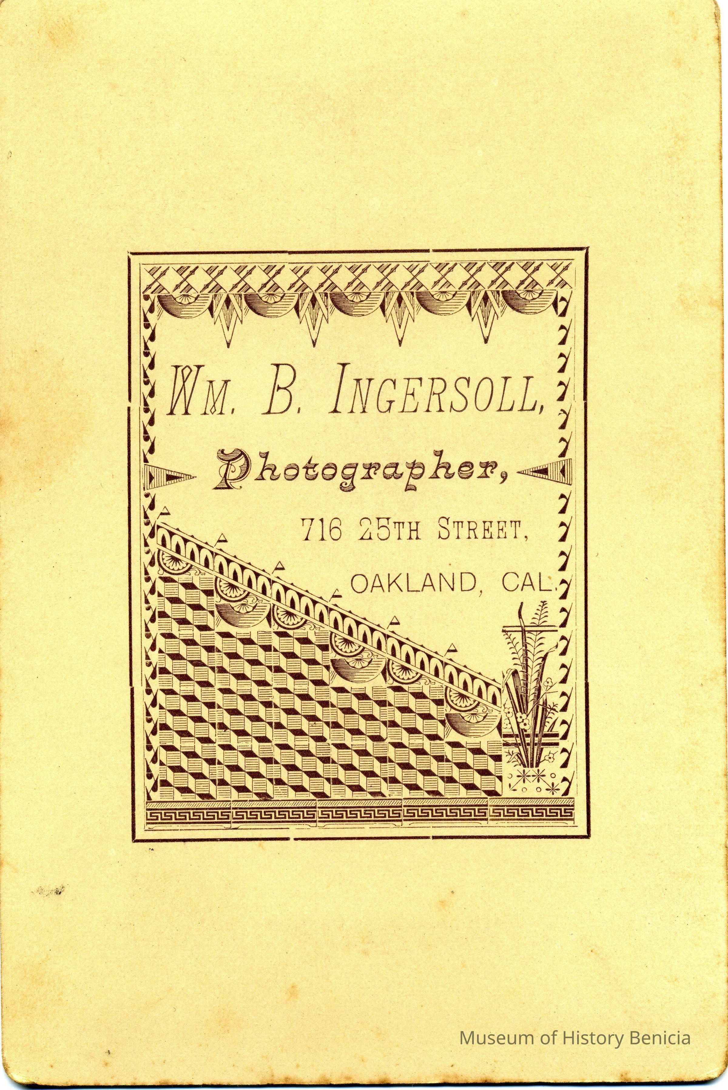 Cabinet photo of a woman. It is in a studio. The image shows some foxing. It came from a photo album of portraits with some photos with names of subjects. Family names: Durrant, Pfister, Dalton, Reynolds, Booth, Gucker. Album is covered in red plush. This photo shows the name Nettie Pfister Reynolds written under the photo in the album. It was taken by Ingersol in Oakland.