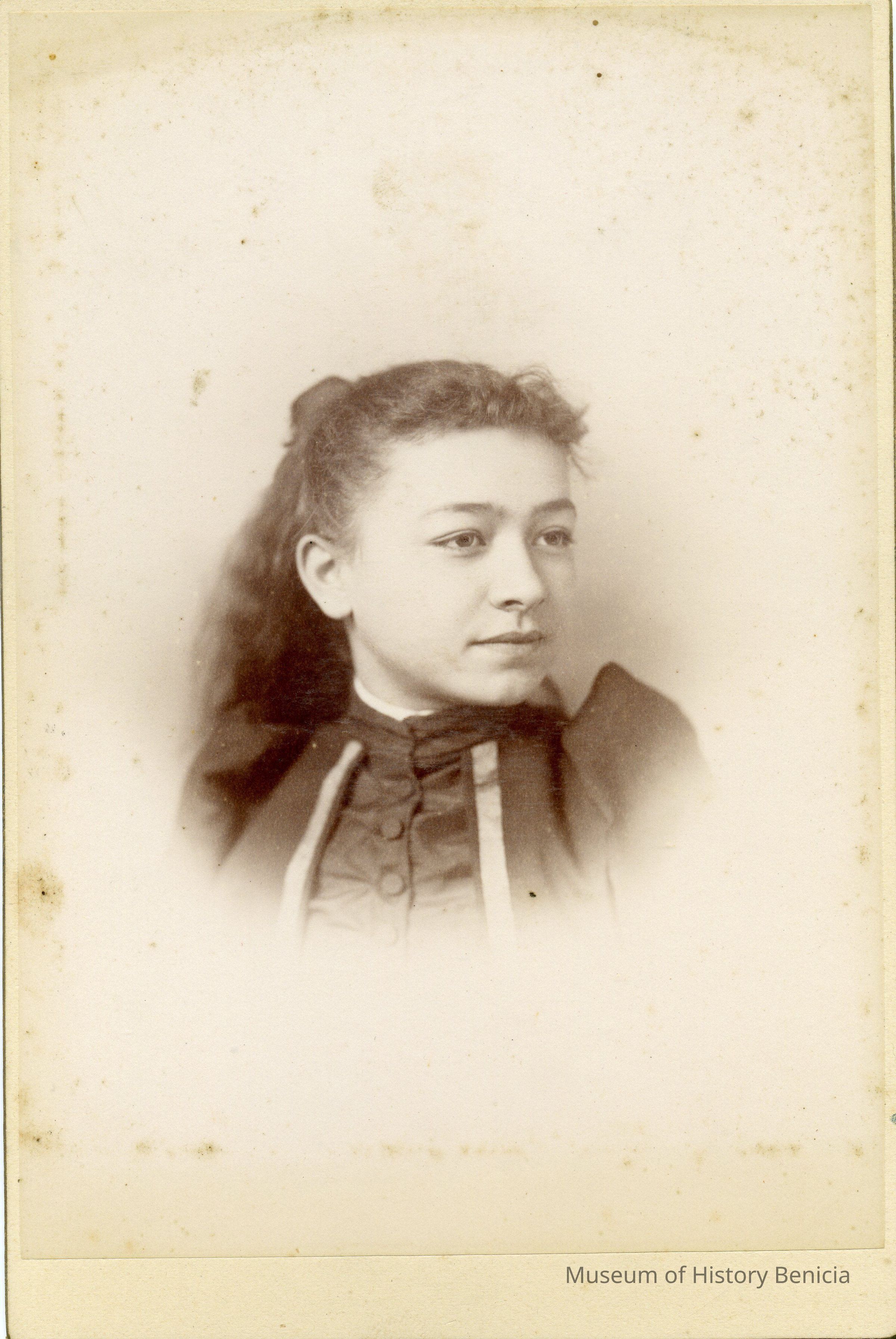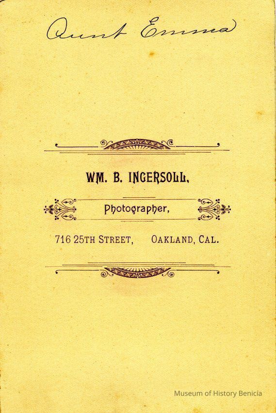Cabinet photo of a woman. It is in a studio. The image shows some foxing. It came from a photo album of portraits with some photos with names of subjects. Family names: Durrant, Pfister, Dalton, Reynolds, Booth, Gucker. Album is covered in red plush. This photo shows the Carrie Welsh. On the back of the photo it says Aunt Emma.